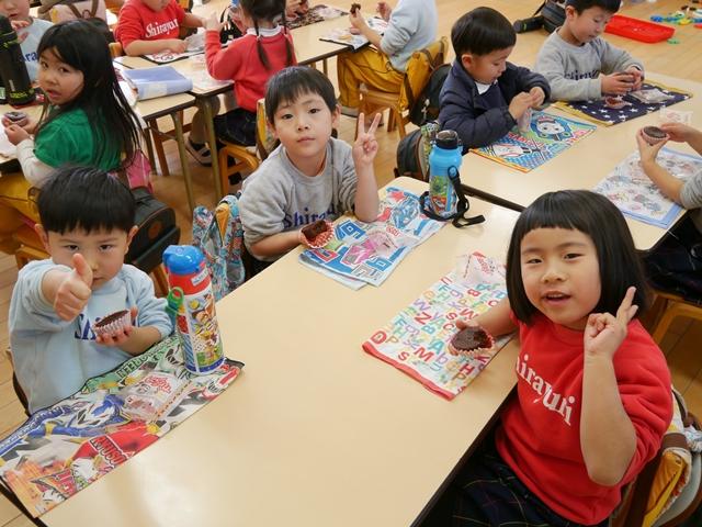 チョコレート味のカップケーキのおやつを食べて、降園します。