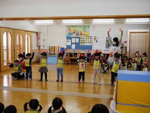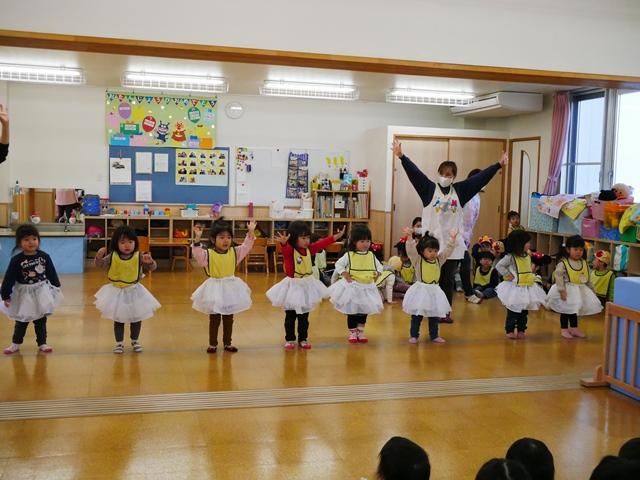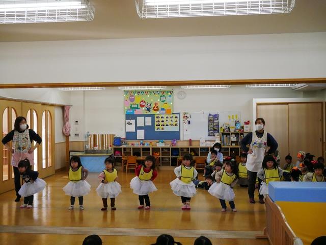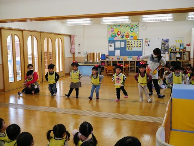 1月も後半にさしかかり、なかよしさんもおゆうぎ会に向けて練習を楽しんでいます。今日は、ひよこ組さんにダンスの発表をしました。