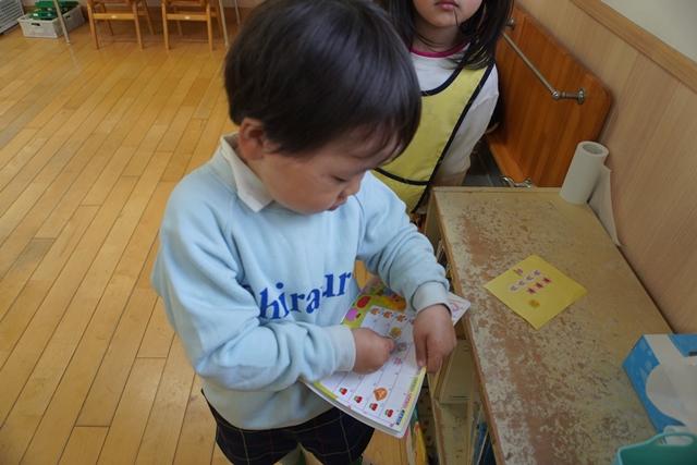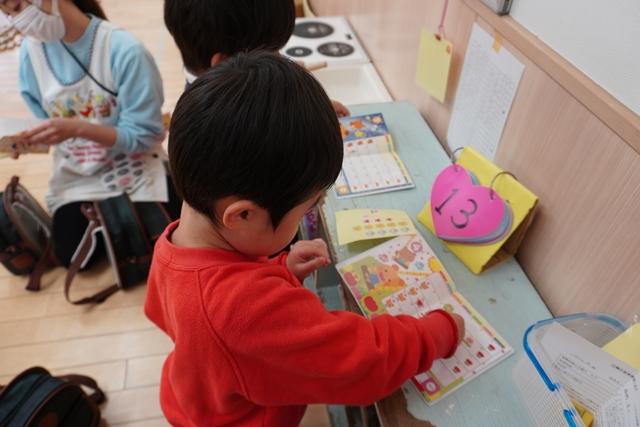 登園して朝のお支度(タオルかけ・シール貼り)をします。「今日は何のシールにしようかな。」と選ぶのも楽しみの1つです。