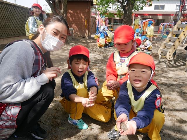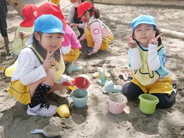 今朝のお外遊びでは、たくさんの砂に大喜びのこどもたち。