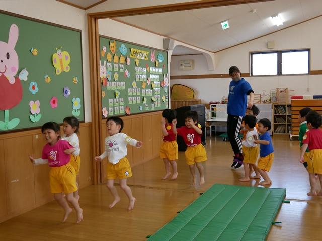 マットの周りを歩いてみたり、ウサギ跳びでピョンピョンしてみたり。