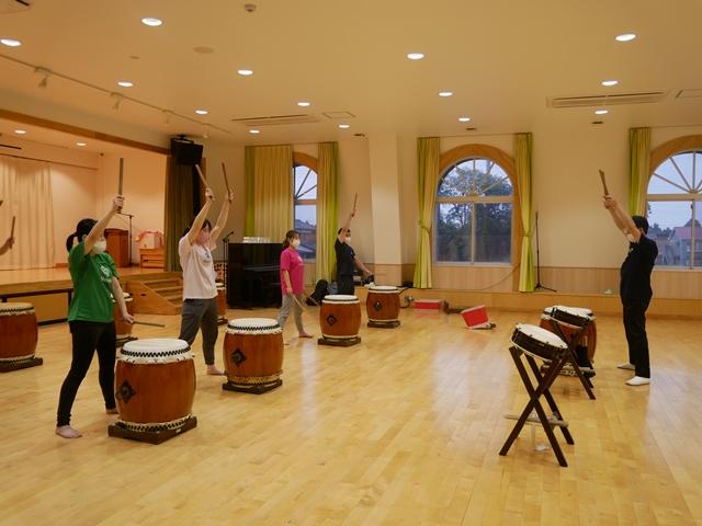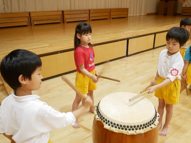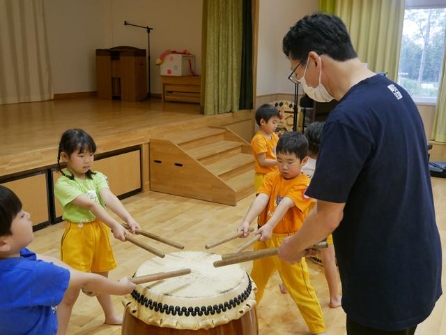倉持先生から、バチの持ち方や姿勢、そしてリズム打ちを学びかけ声もつけながら太鼓をたたきました。