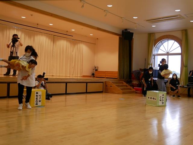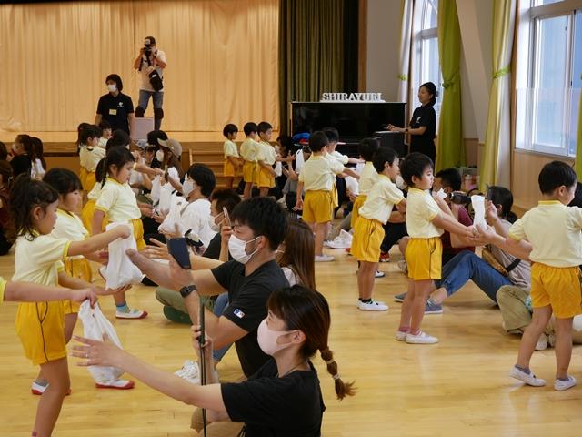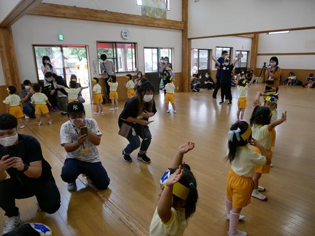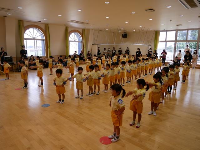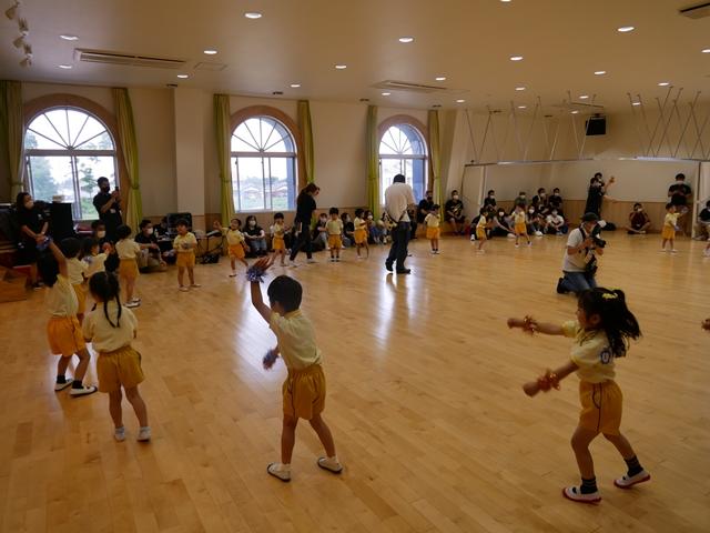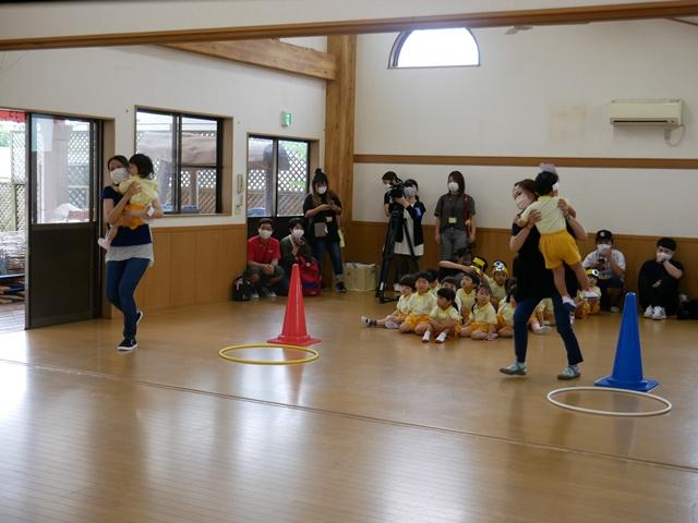 ホールでは、ほしA組・とんぼA組のお友達が元気いっぱいダンスや親子競技を楽しみました。