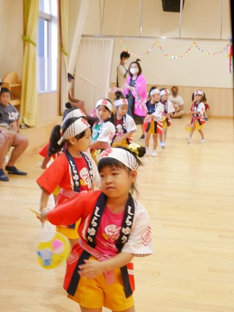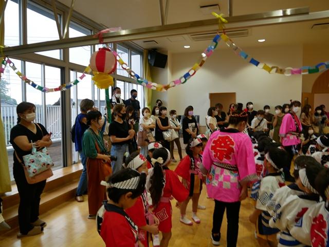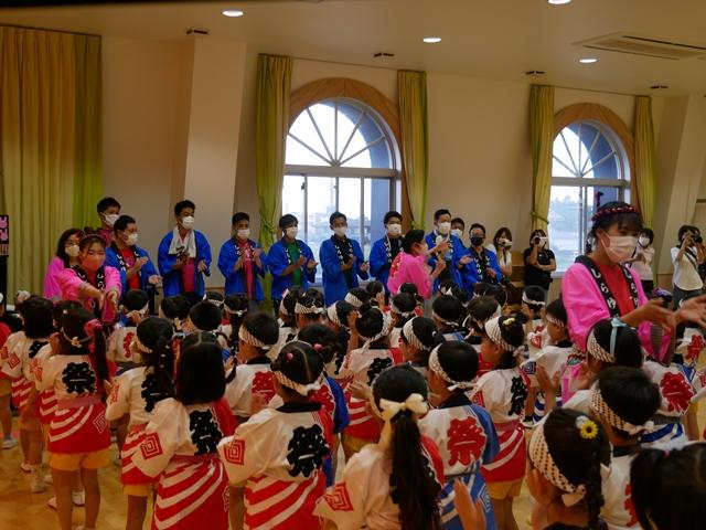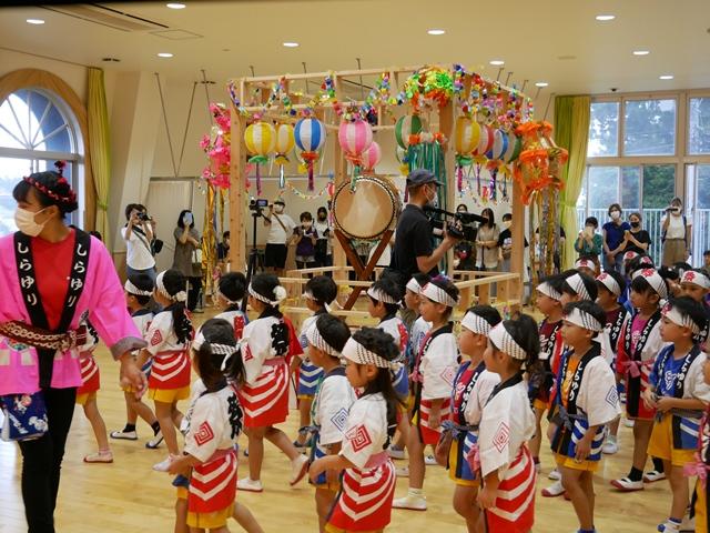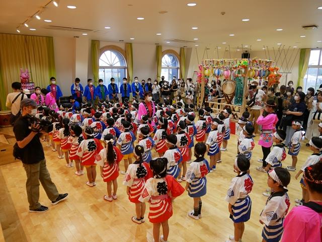 ホールでは、集合写真撮影をして、しらゆり音頭や親子盆踊りを踊りました。