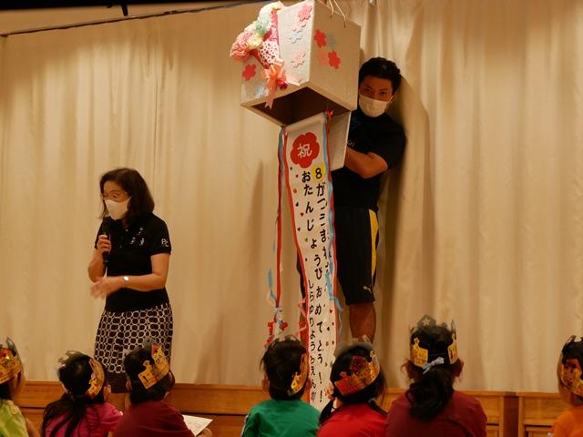 𠮷羽先生からのたかいたかいのプレゼントと園長先生から誕生ブックのプレゼントをもらい、とっても嬉しそうでした。