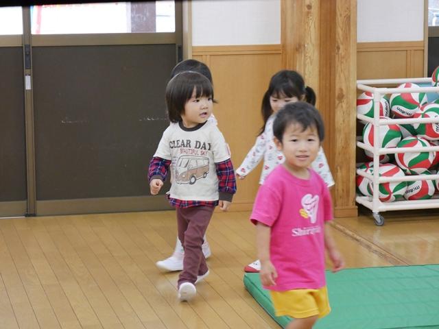 タンバリンの音に合わせて、マットのまわりをお散歩したり、うさぎさんに変身してピョンピョン跳んだり、みんなとっても楽しそう♪