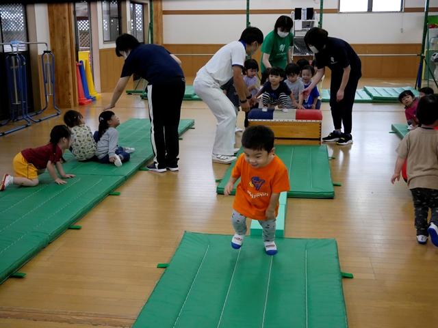 次は、跳び箱からジャンプしたり、橋を渡ったり、順番に挑戦していきます。
