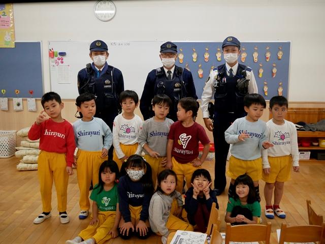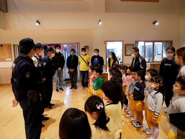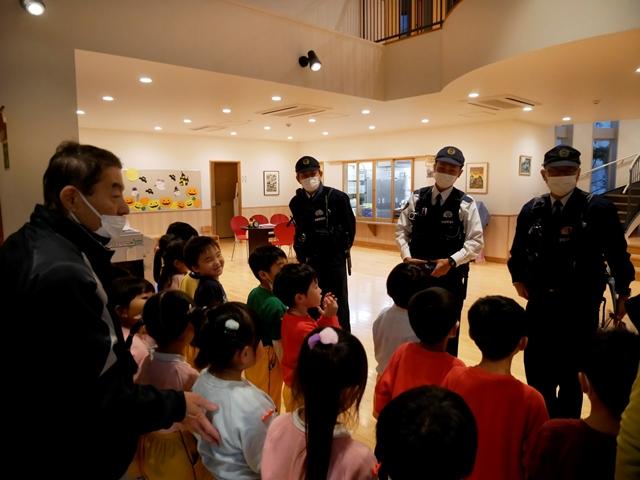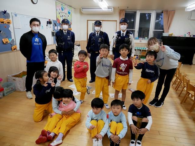 お泊まり会にあたり、みんなが安心して宿泊できるように、警察の方もいつもより念入りにパトロールをしてくださいました。警察の方のお話を聞いたり、一緒に記念写真を撮ったり、貴重な機会でしたね。