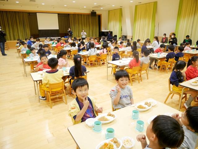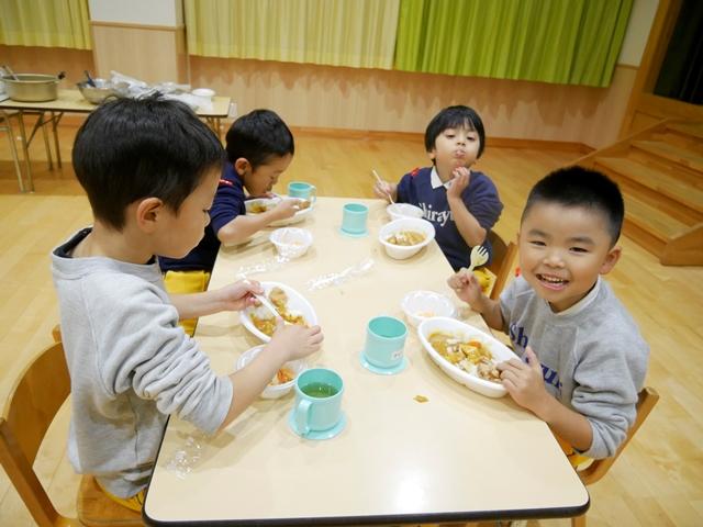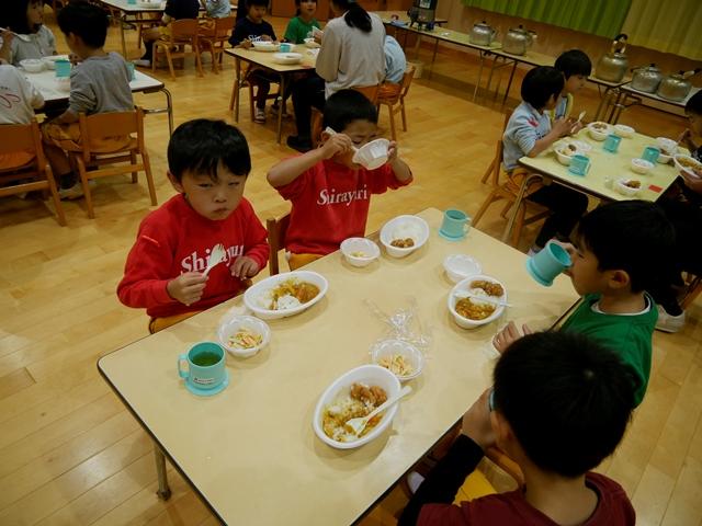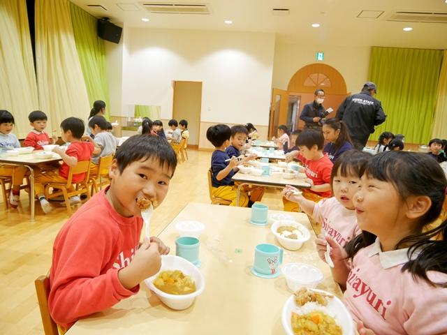 給食室の先生が、みんなが大好きなカレーと唐揚げ・マカロニサラダを作ってくれました。