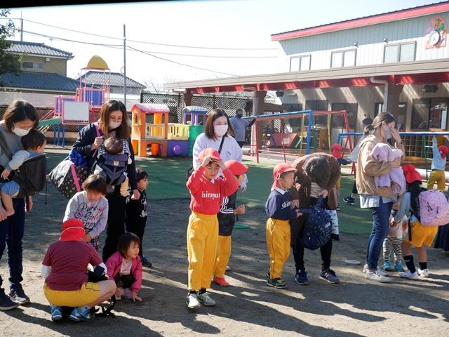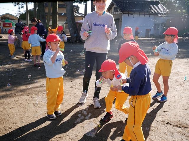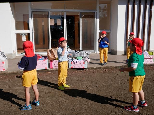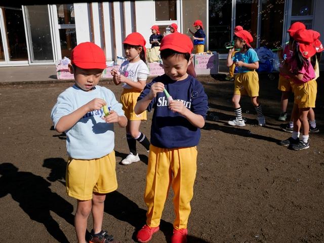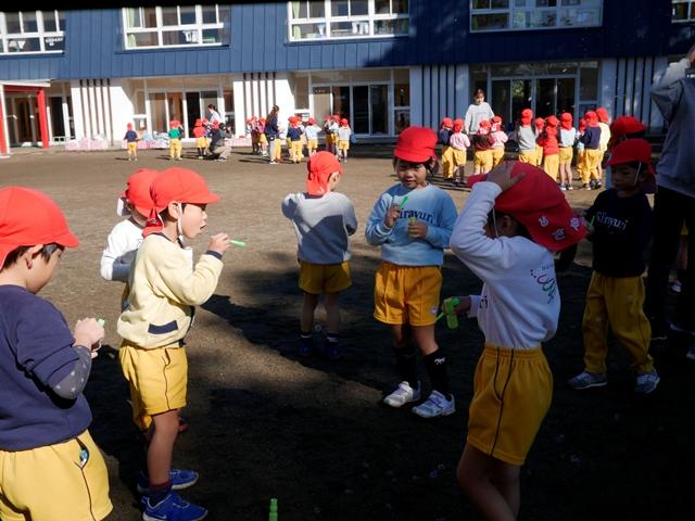 帰りの支度を整えて、園庭でシャボン玉や外遊びを楽しみました。
