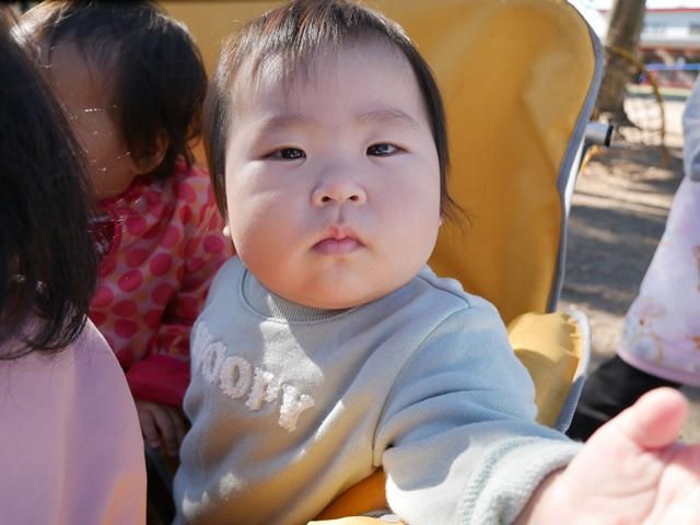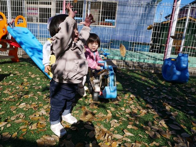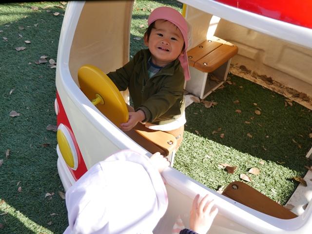 お散歩カーでお外に出たお友だちは、うさぎさんを見たり、どんぐりや落ち葉を見つけました。