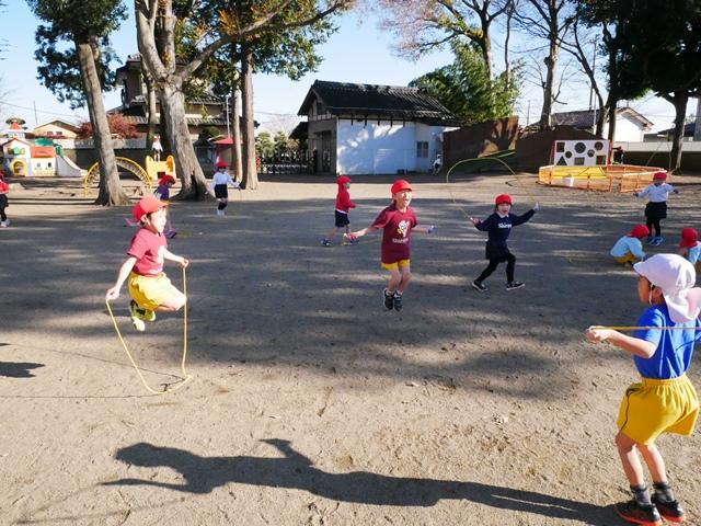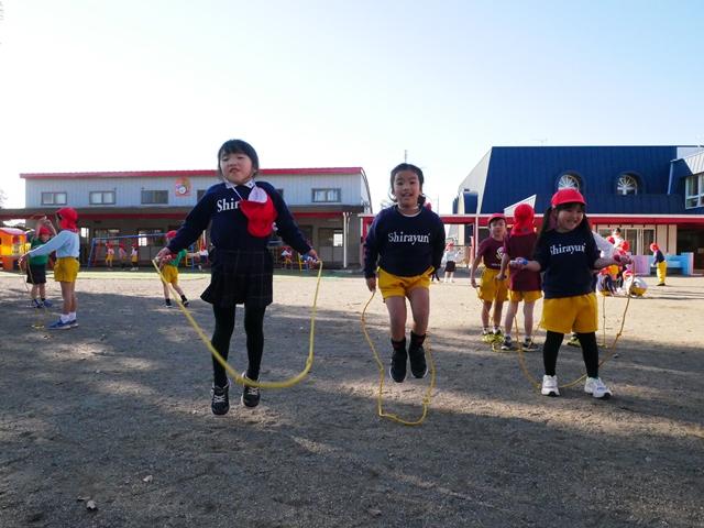 午後は、園庭でたくさん遊びます。浅井先生の体操でなわとびを始めたので、お外遊びの時間でも少しずつ練習しています。