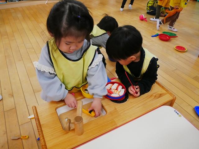お昼寝から起きて、おやつを食べたら室内遊びをして過ごします。