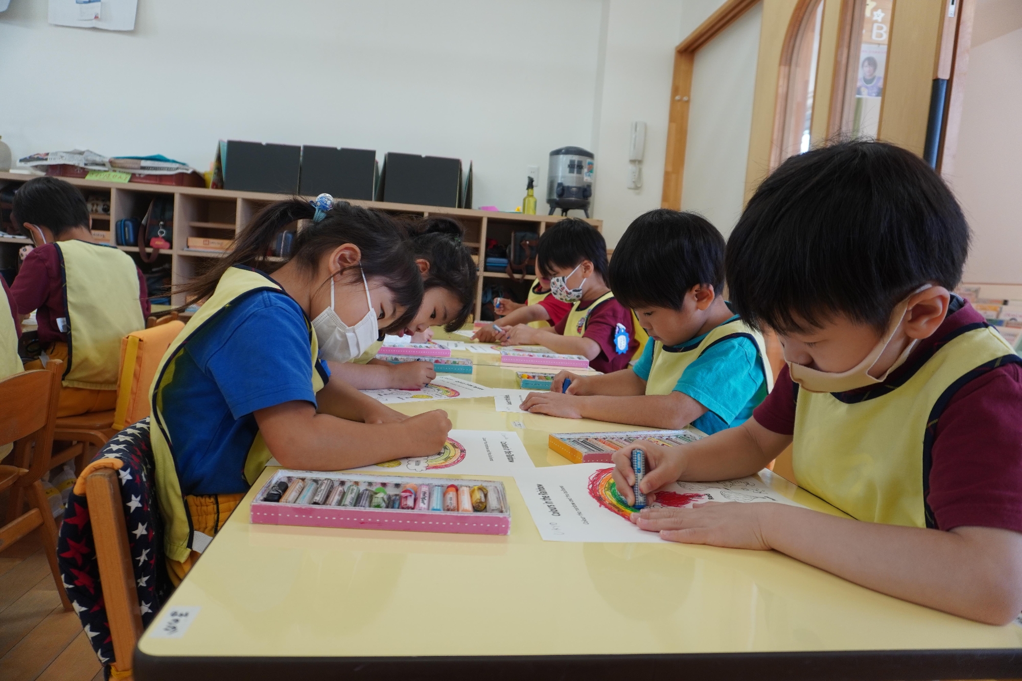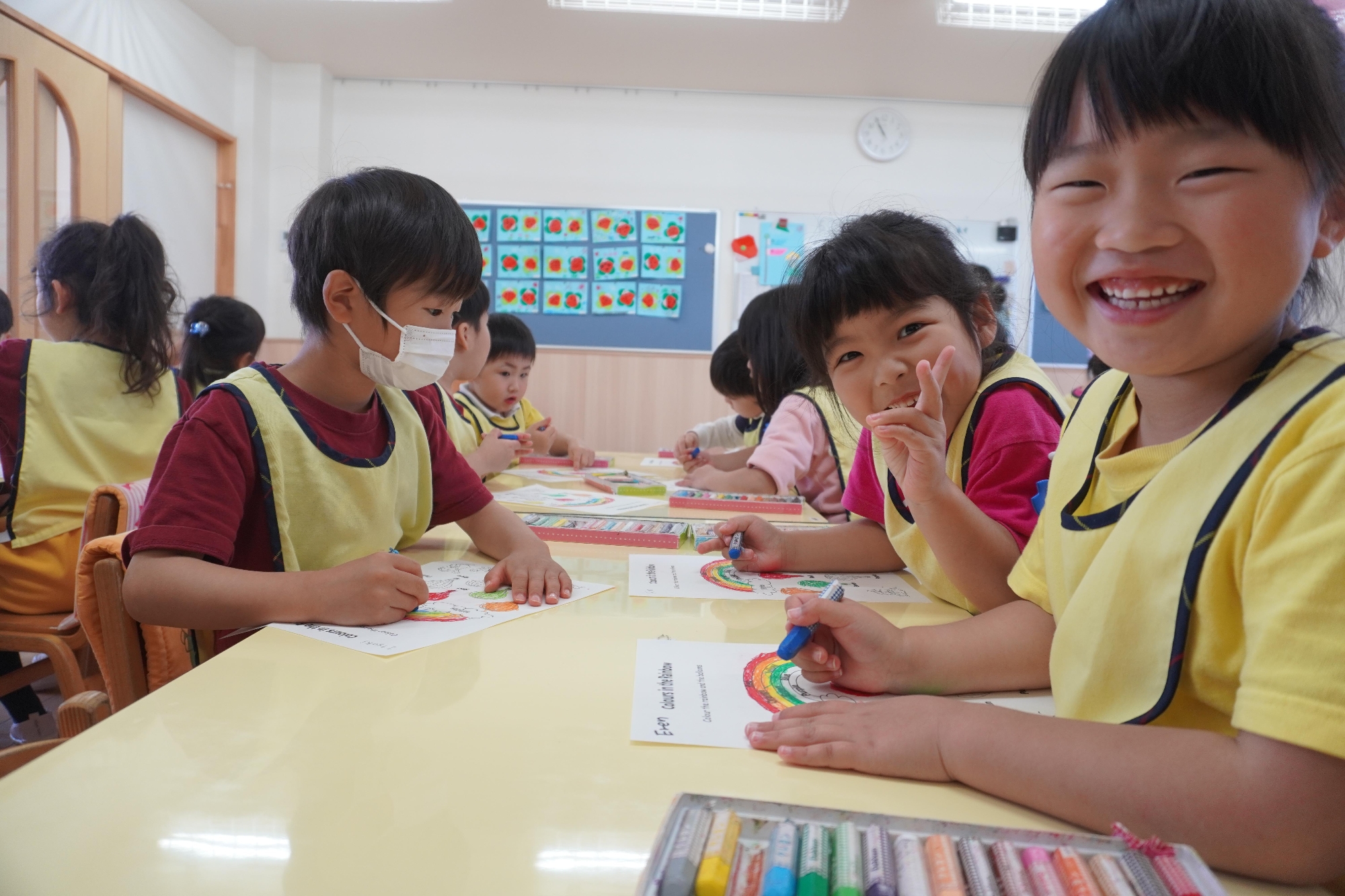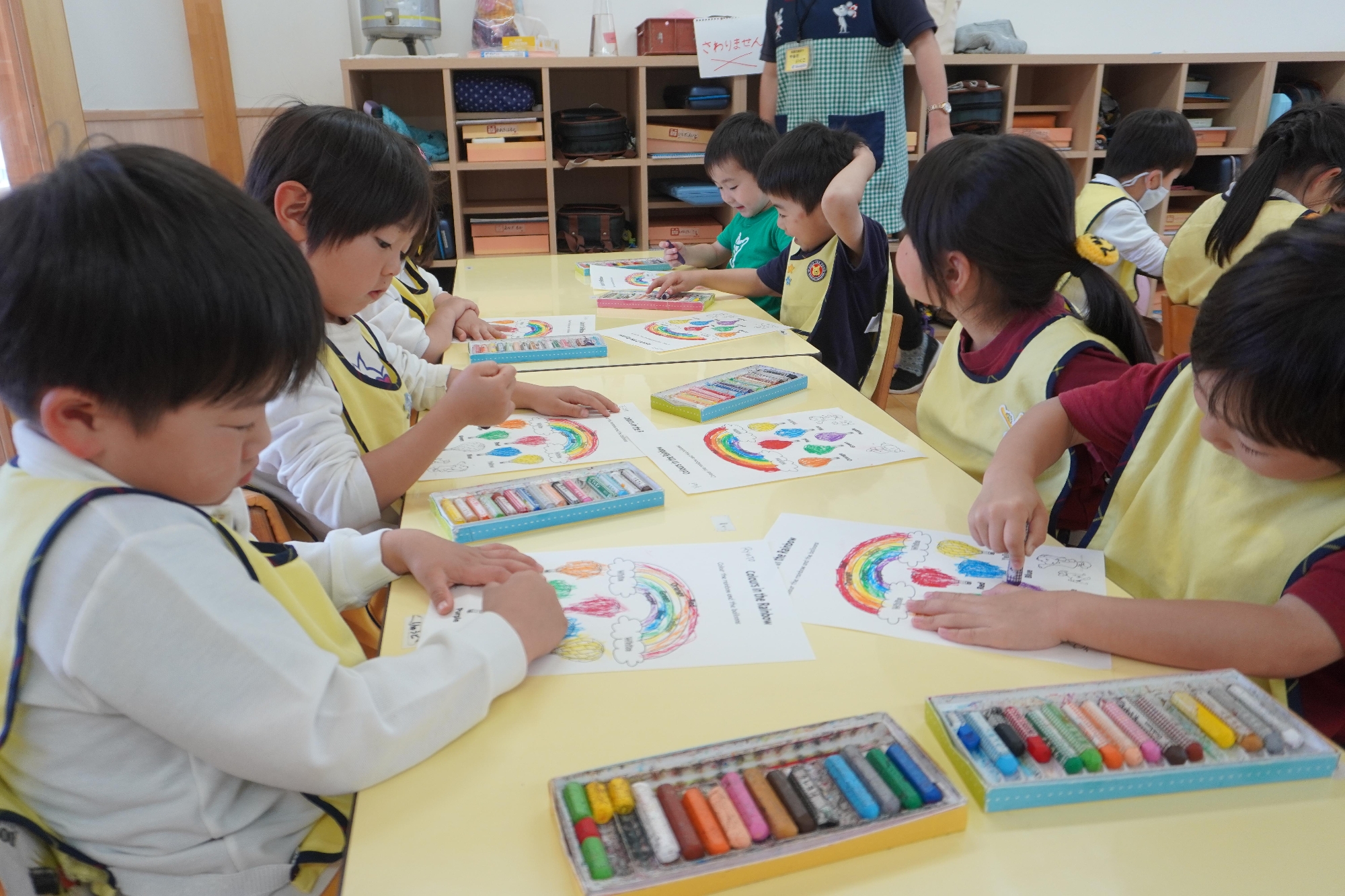これまで習った色を表すえいごを使って、虹と気球の色塗りをしました。
