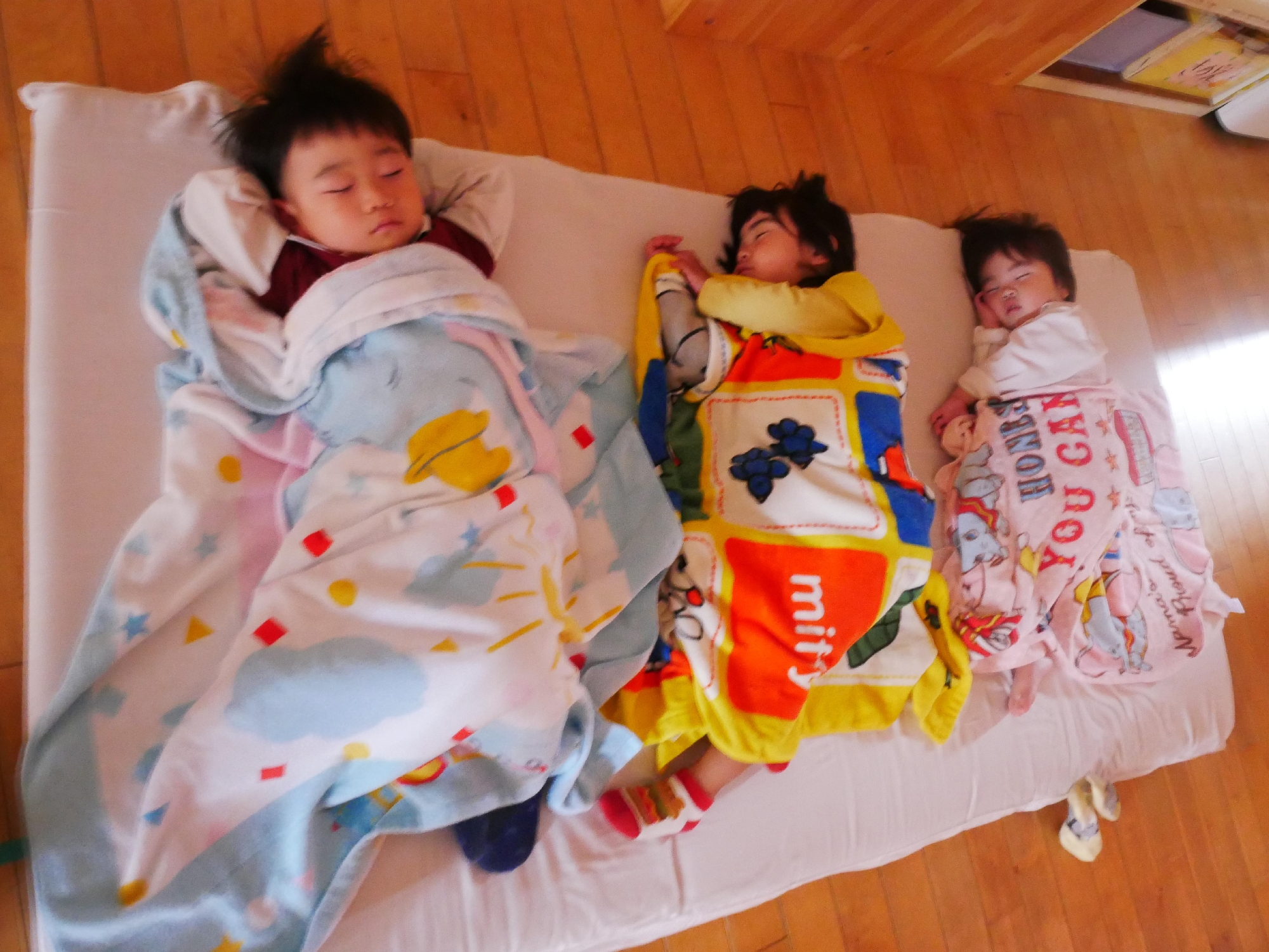 担任の先生に紙芝居を読んでもらってから、「おやすみなさい」と言ってみんなで上手に布団にゴロンとできていますね。