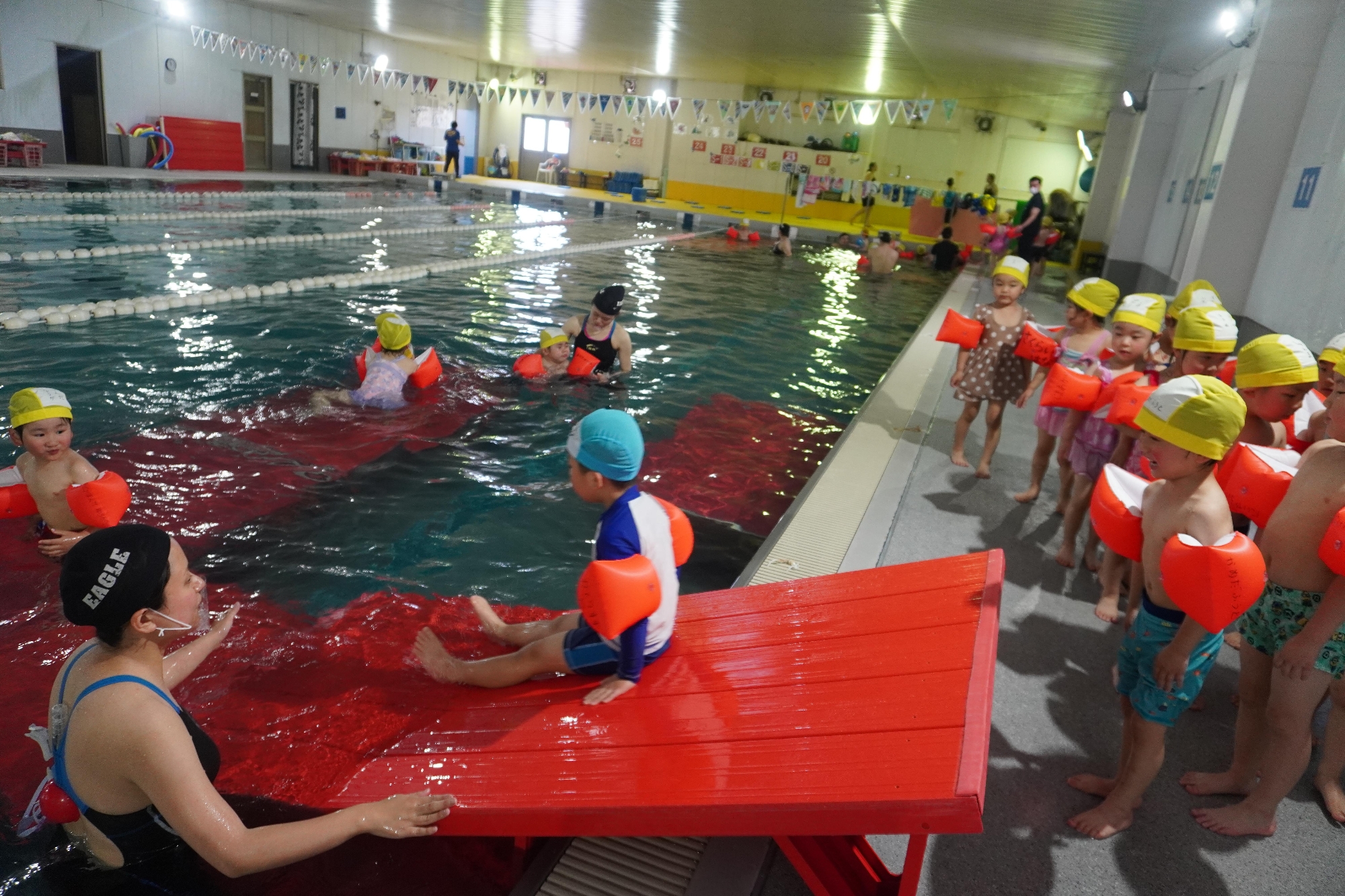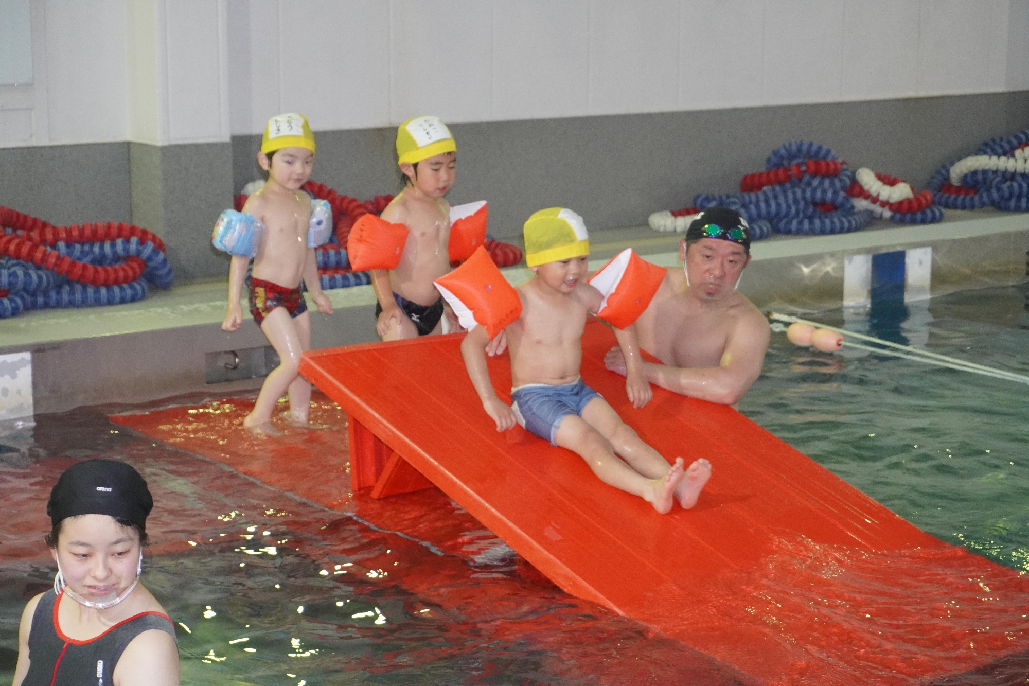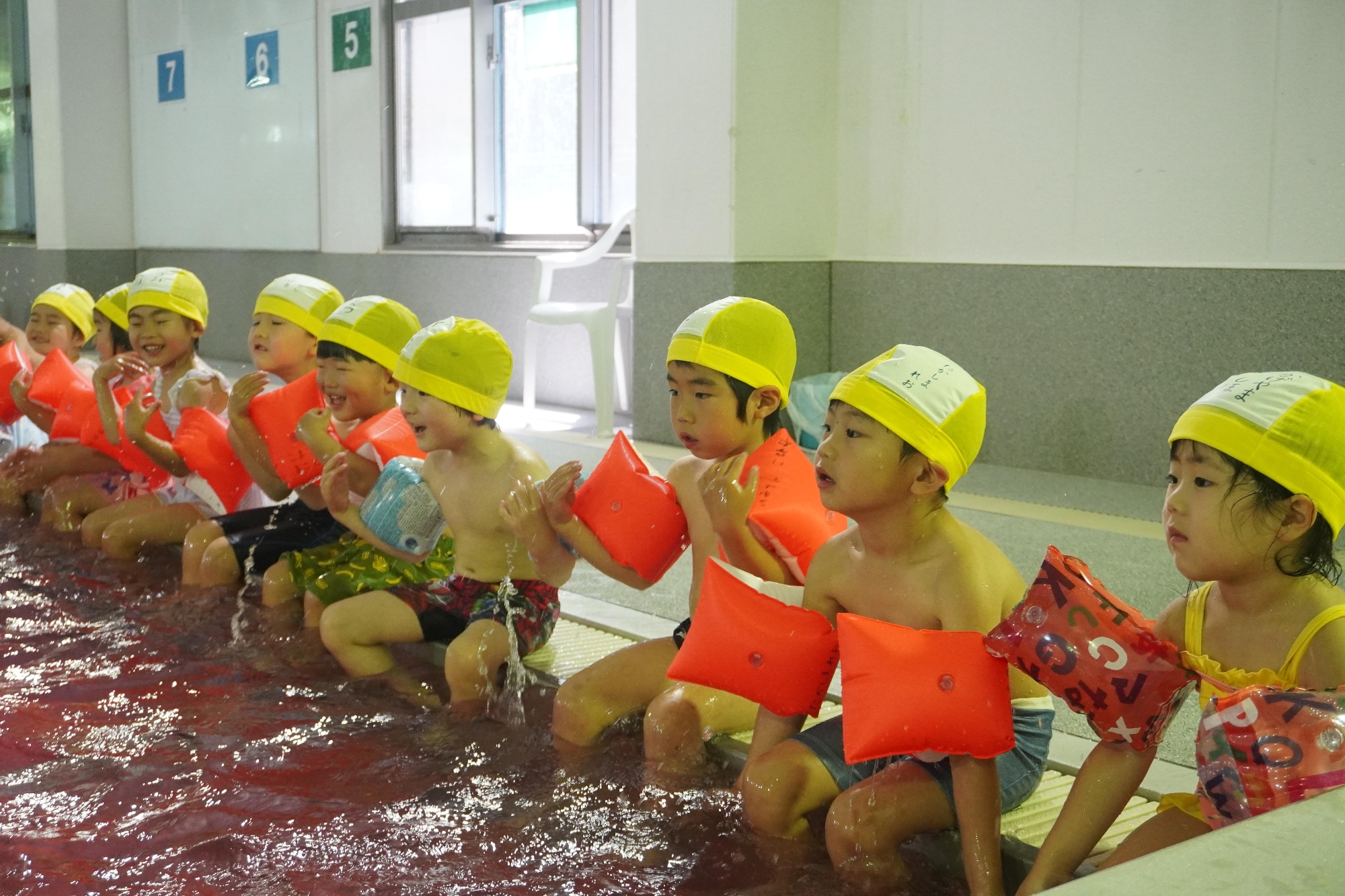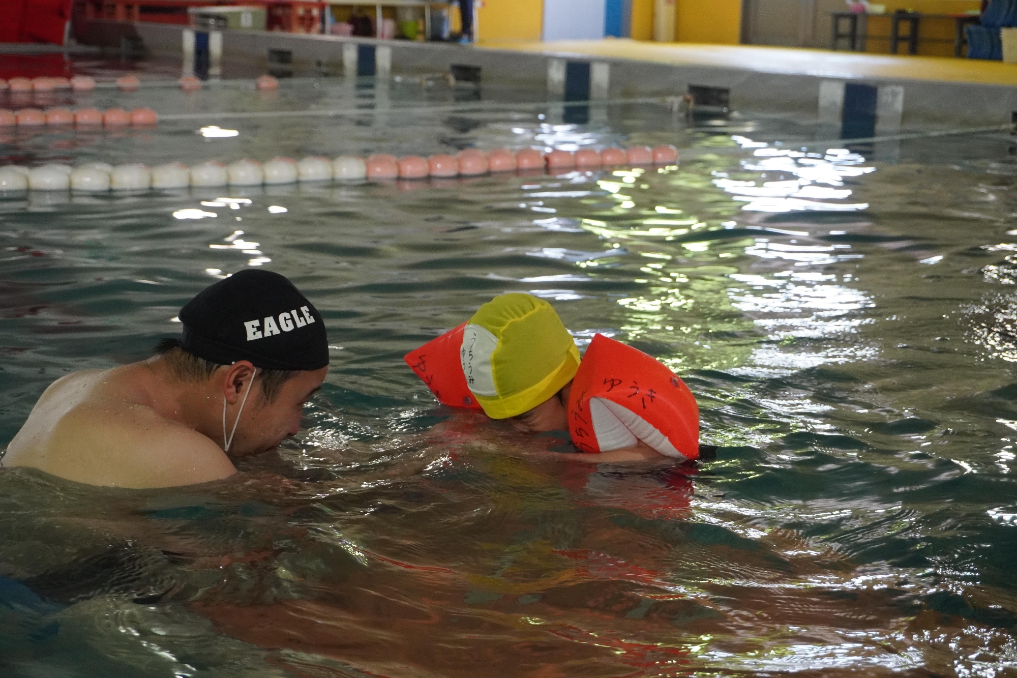 スイミングのコーチの話をよく聞き、カニさん歩きやバタ足等、たくさんのことをやりました。