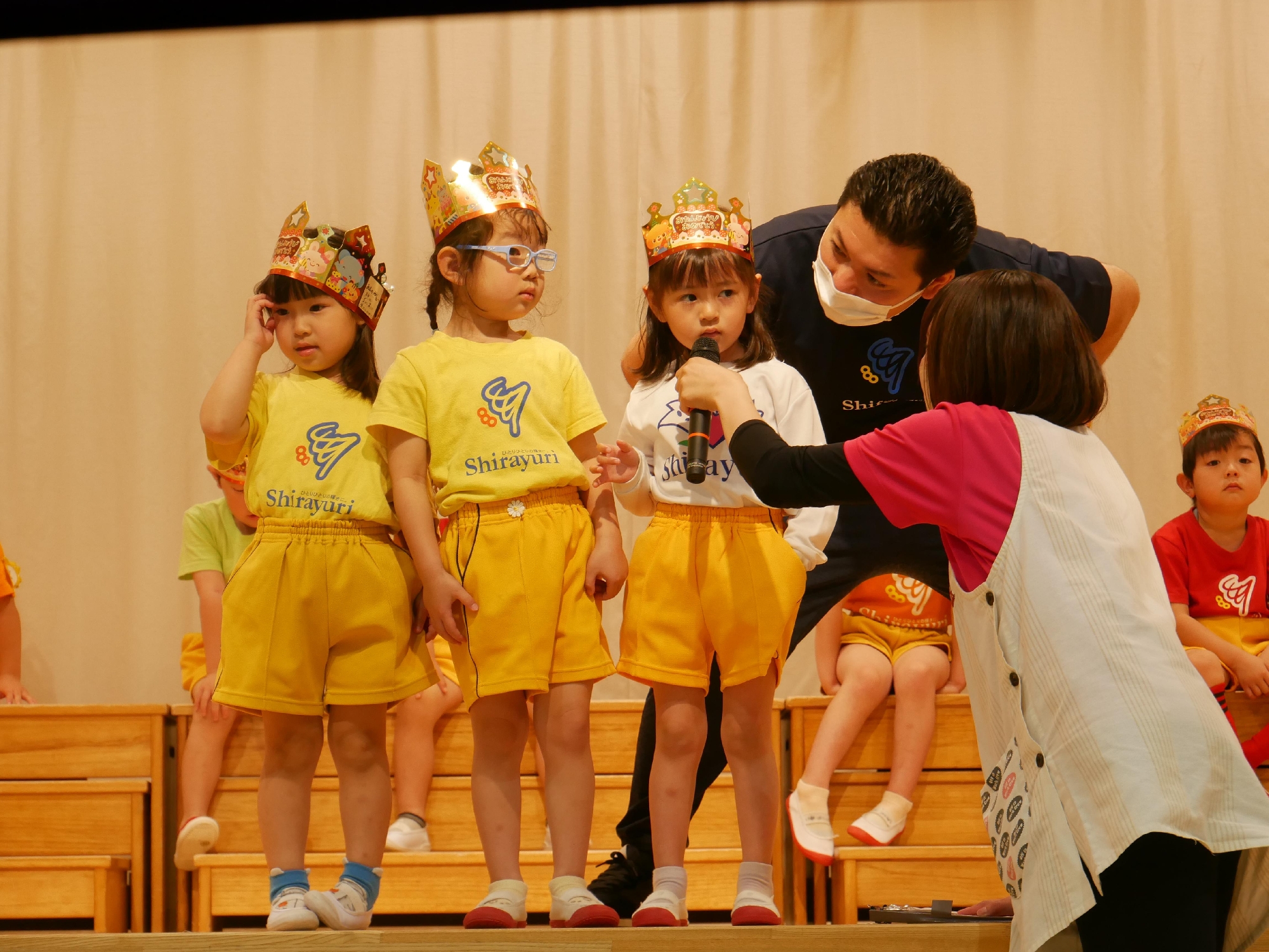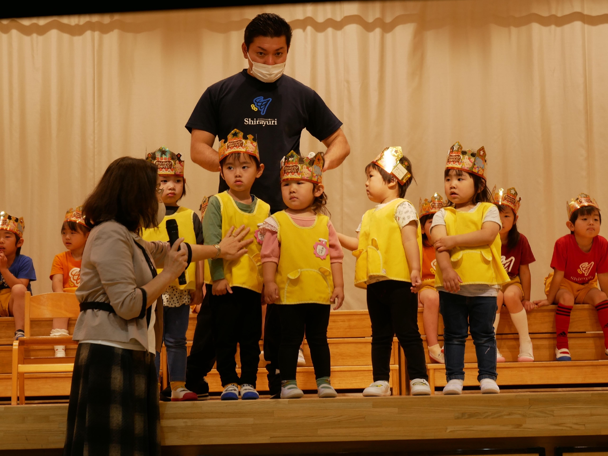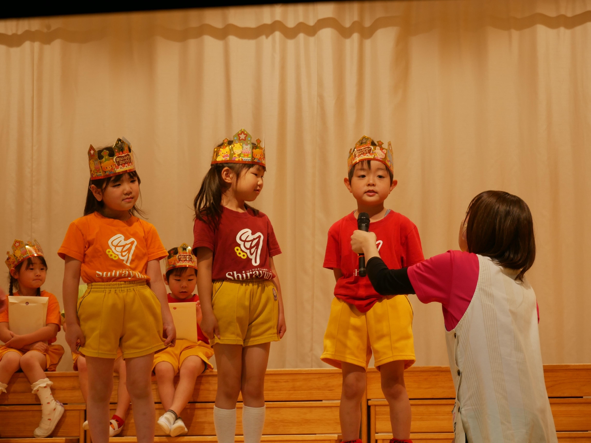 お客さんがいっぱいで、ソワソワしていたお友達もいましたが、上手にお名前やクラス、好きな食べ物等、発表できました♪