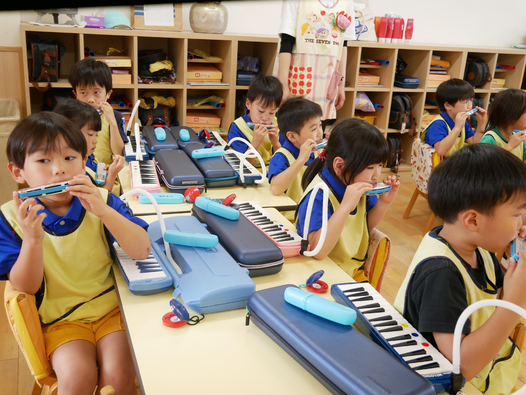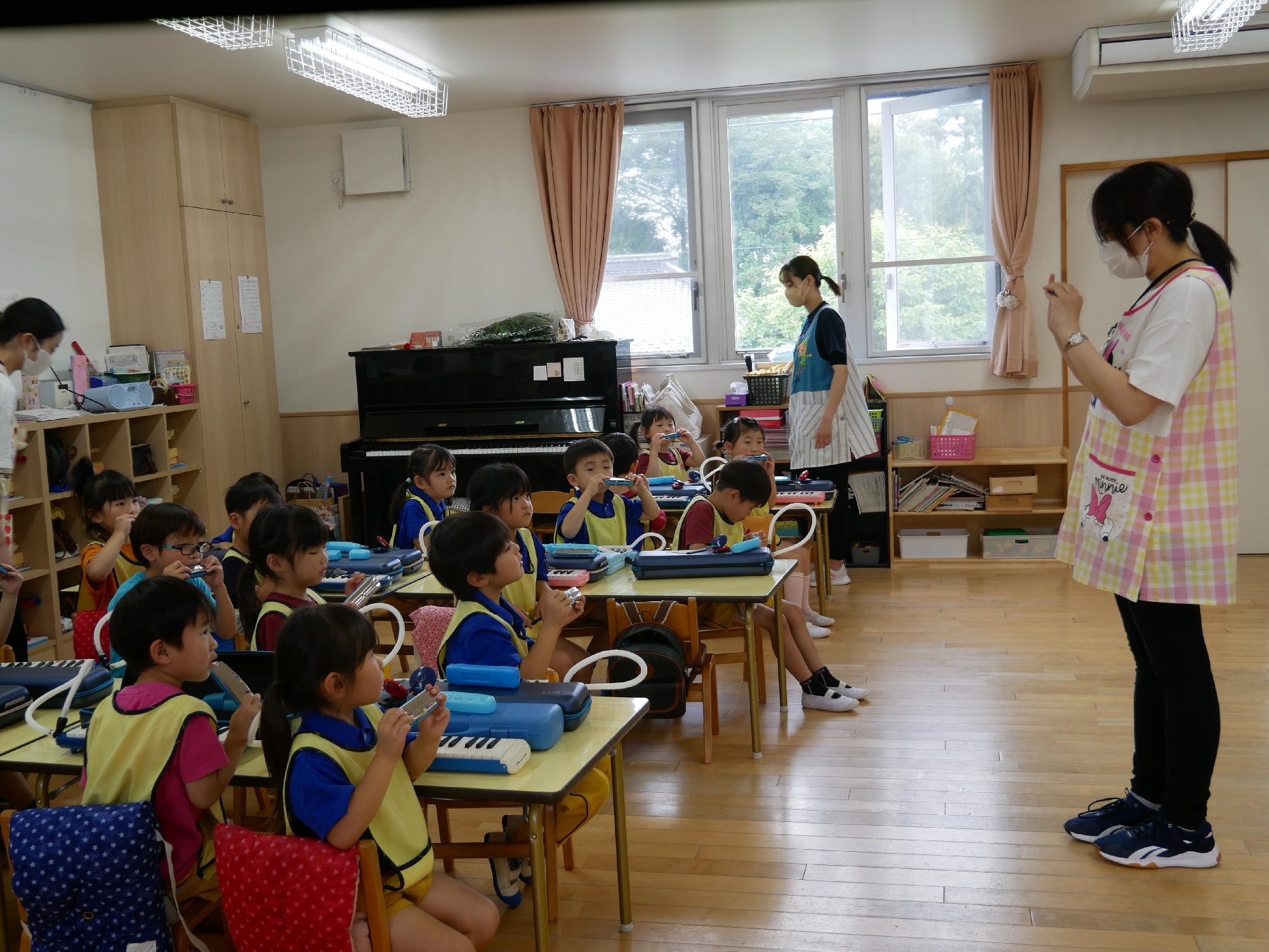 松坂先生やクラス担任の先生、実習生と一緒に、ピアニカやハーモニカをやりました。