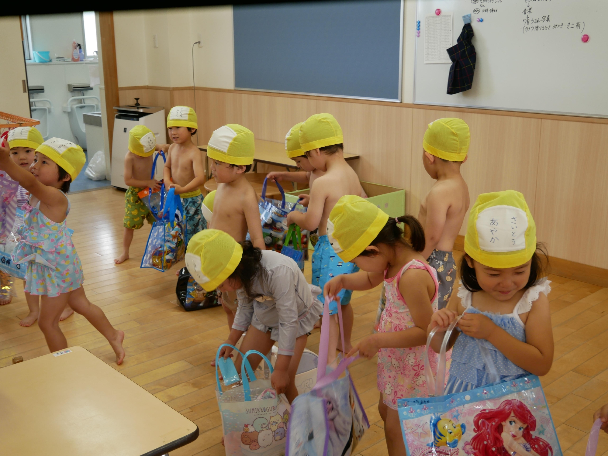 プールバッグを使える日がきて、みんなとっても嬉しそう♡
