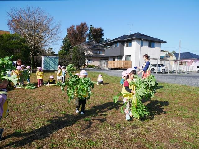 なかよしランドは、畑にはいかずにはらっぱ広場で大根運びを行いました。