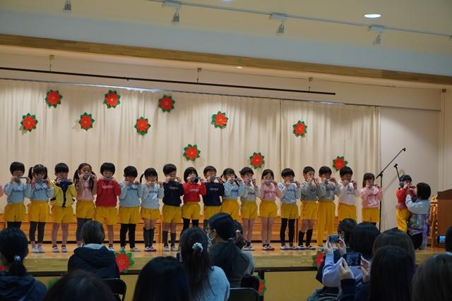 はじめに、各クラスごとにハーモニカの演奏・歌の発表をしました。