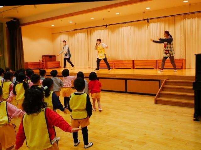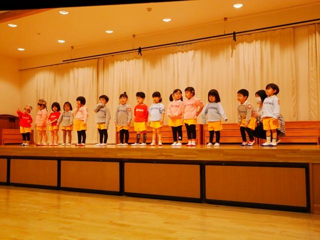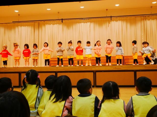 『♪コンコンクシュン』の歌を歌いました。舞台に上がり、元気に発表することができました。