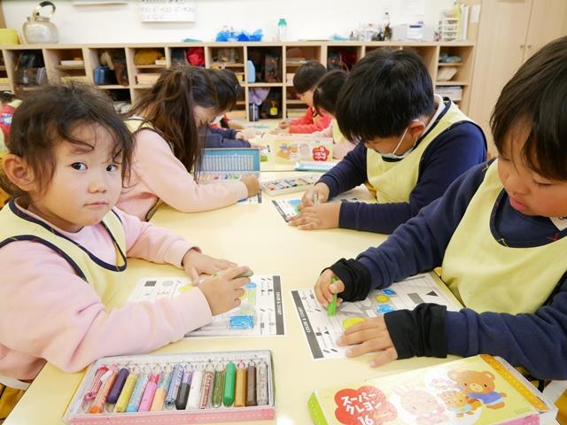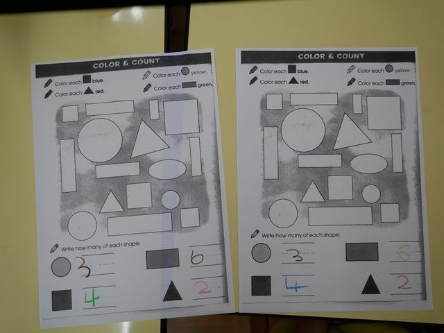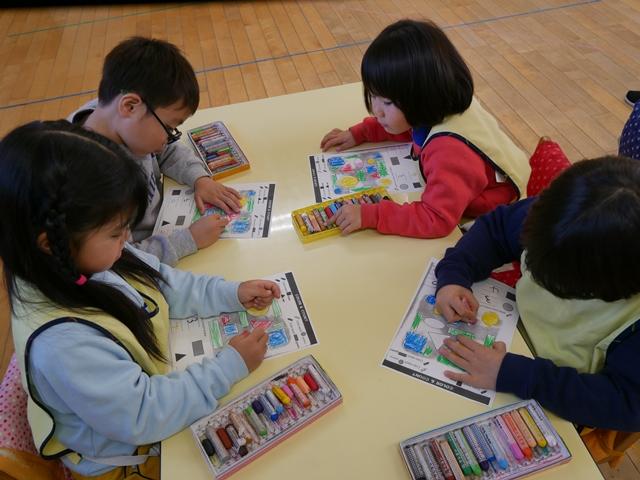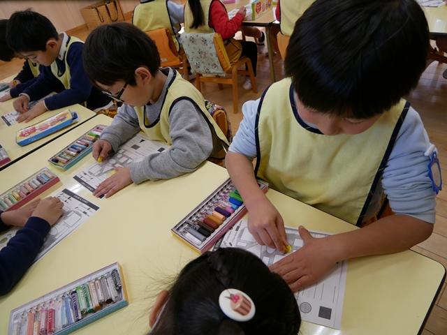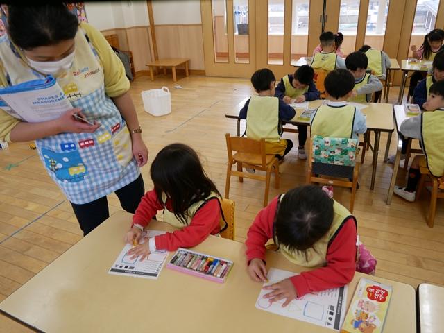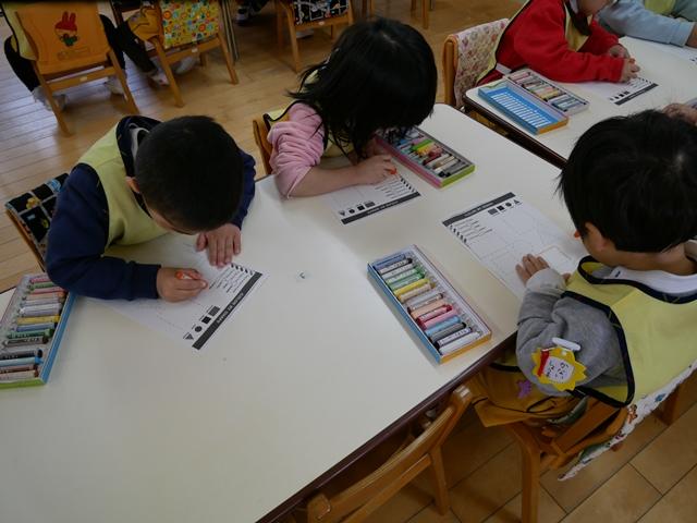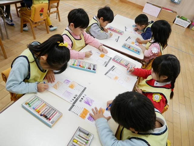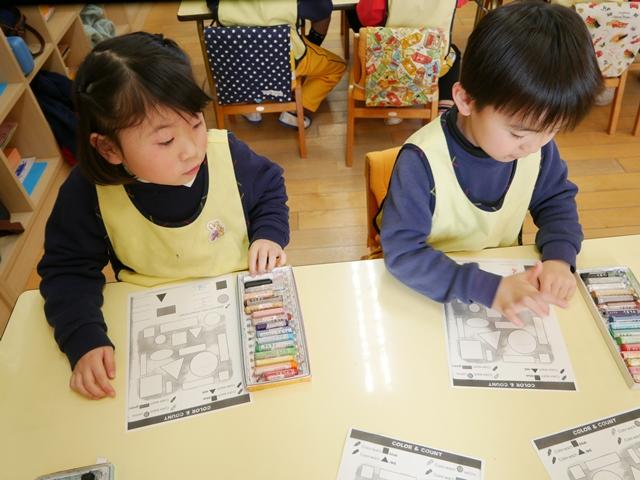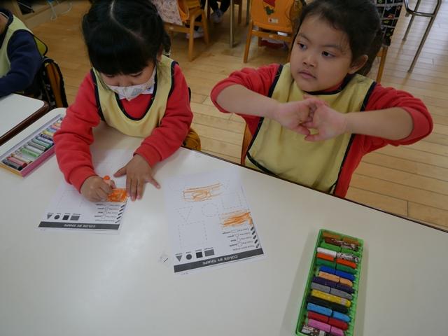 とんぼ組は、青は英語でなんて言うかな?と色に親しみ、〇や□を色塗りしました。
