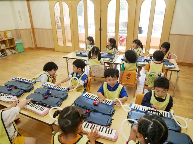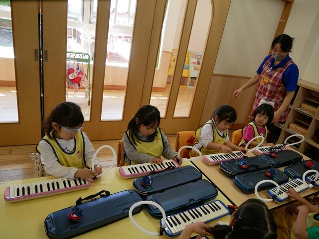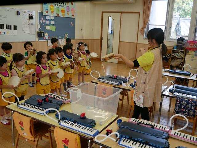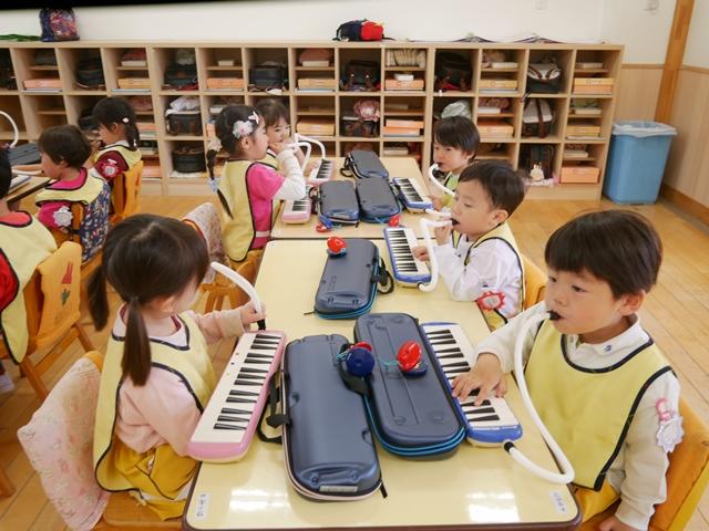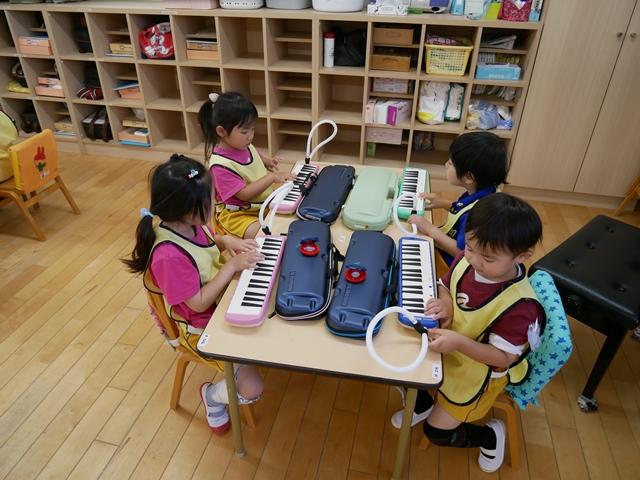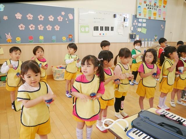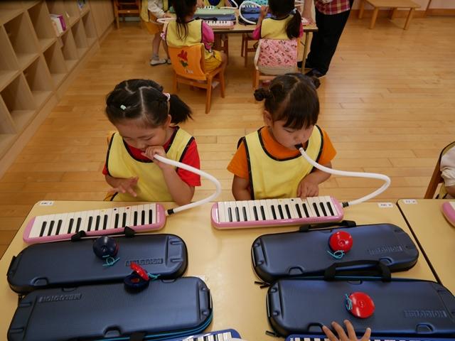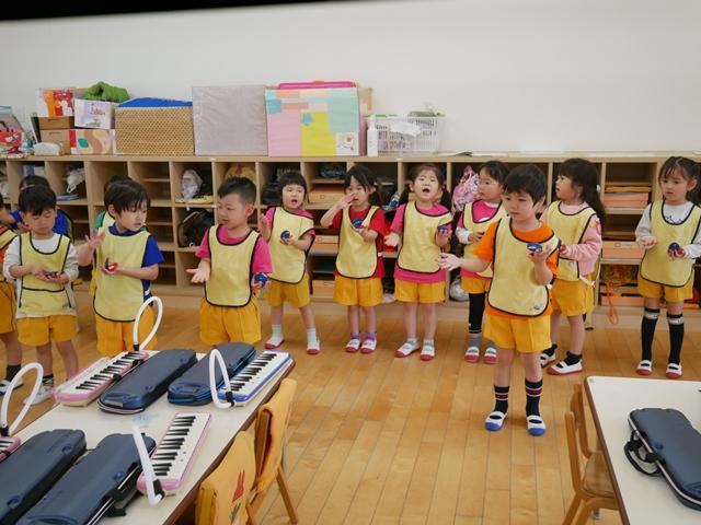 鍵盤ハーモニカでドレミを弾いたり、カスタネットやタンバリンをリズミカルにたたいてみたり、いっぱい楽しみました♪