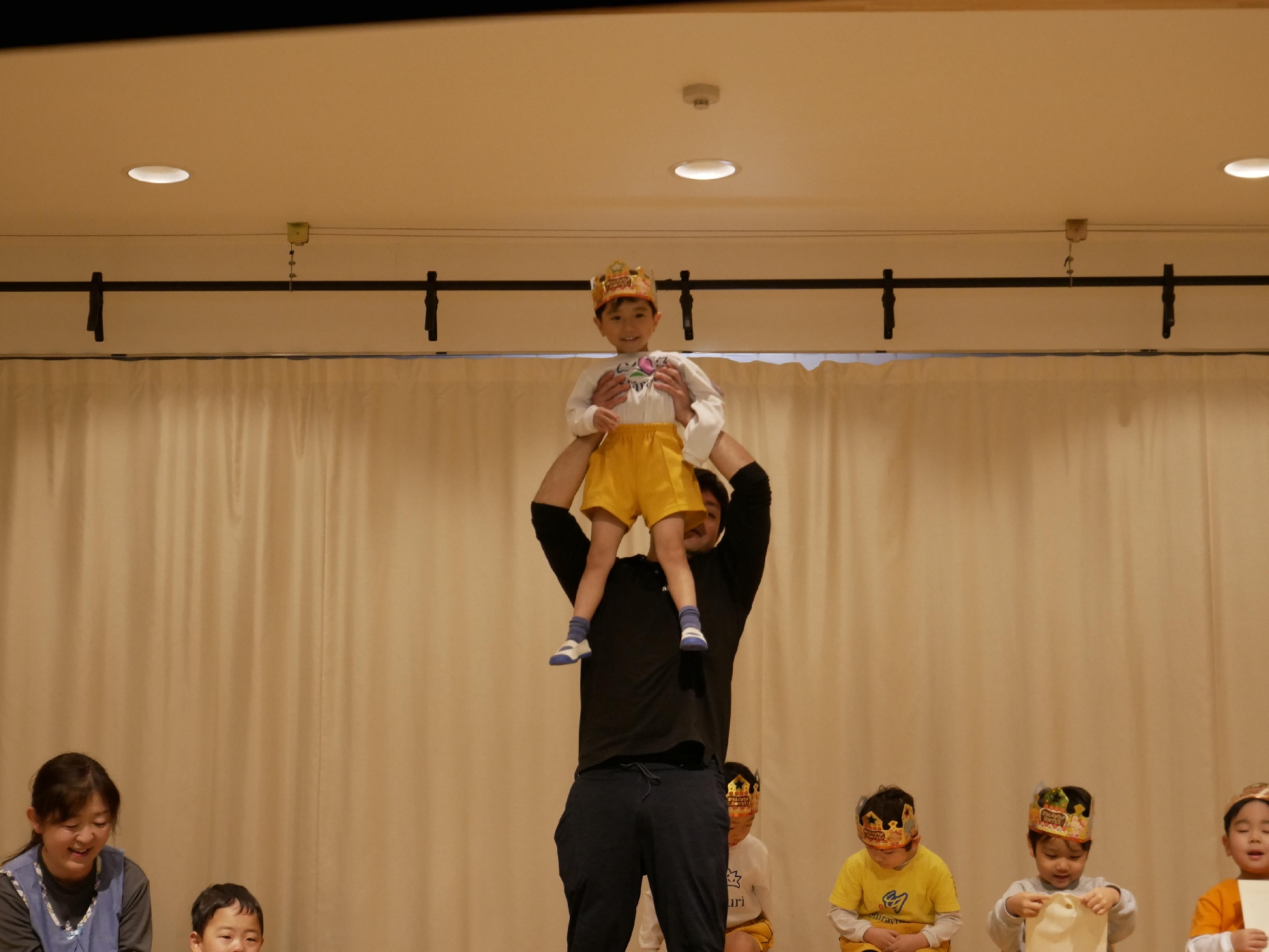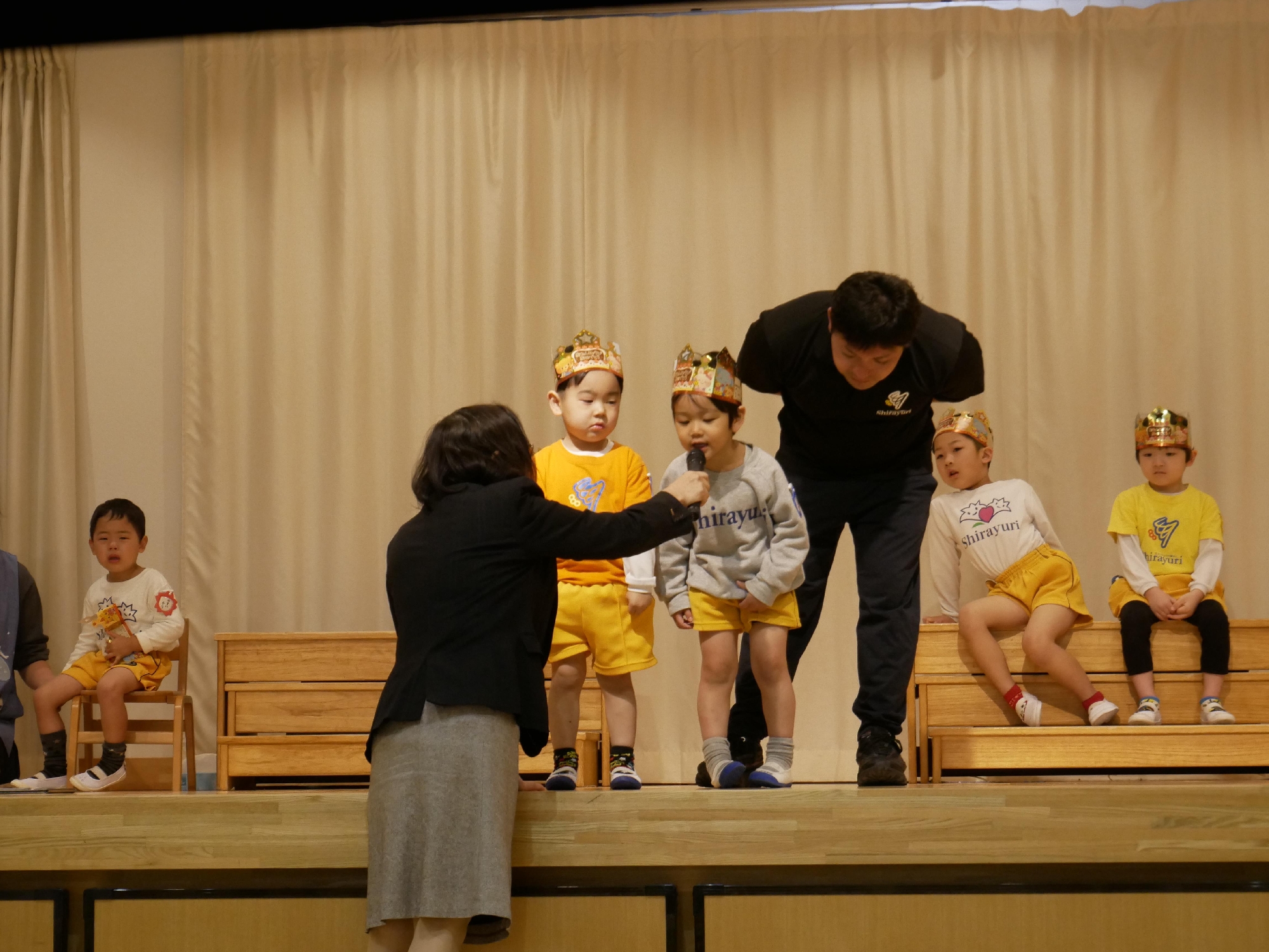 キラキラの冠をかぶったお友だちが舞台に上がりみんなでお祝いをしました。