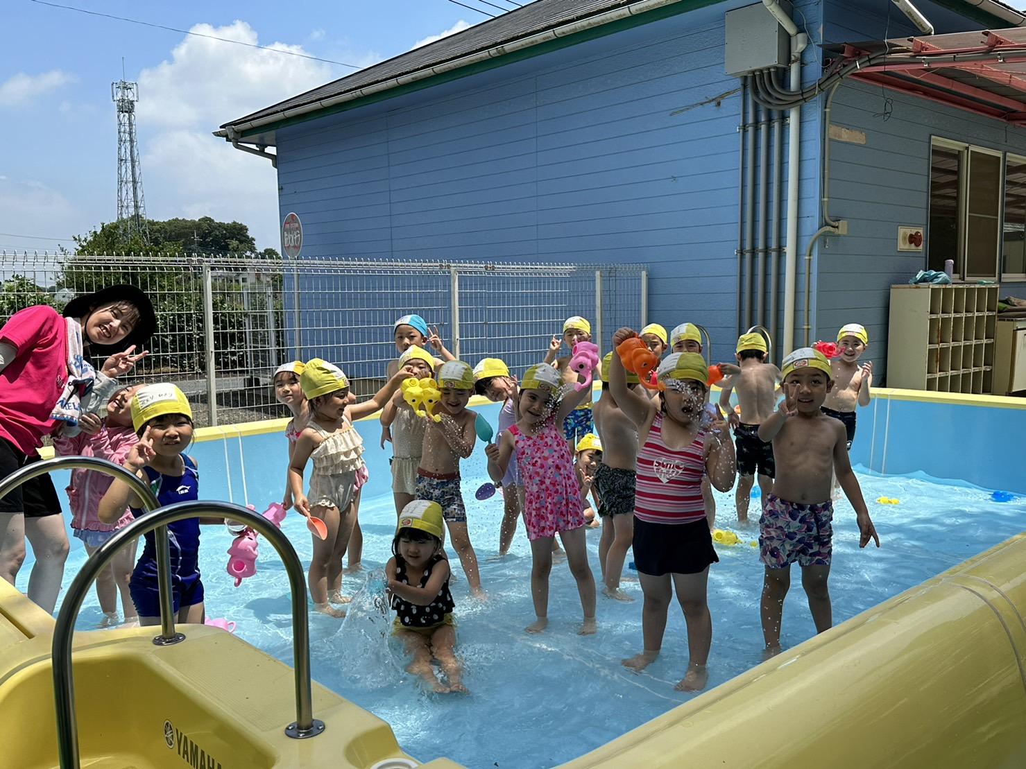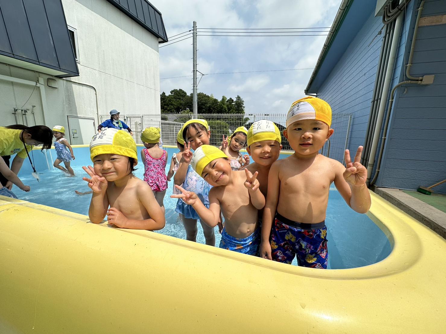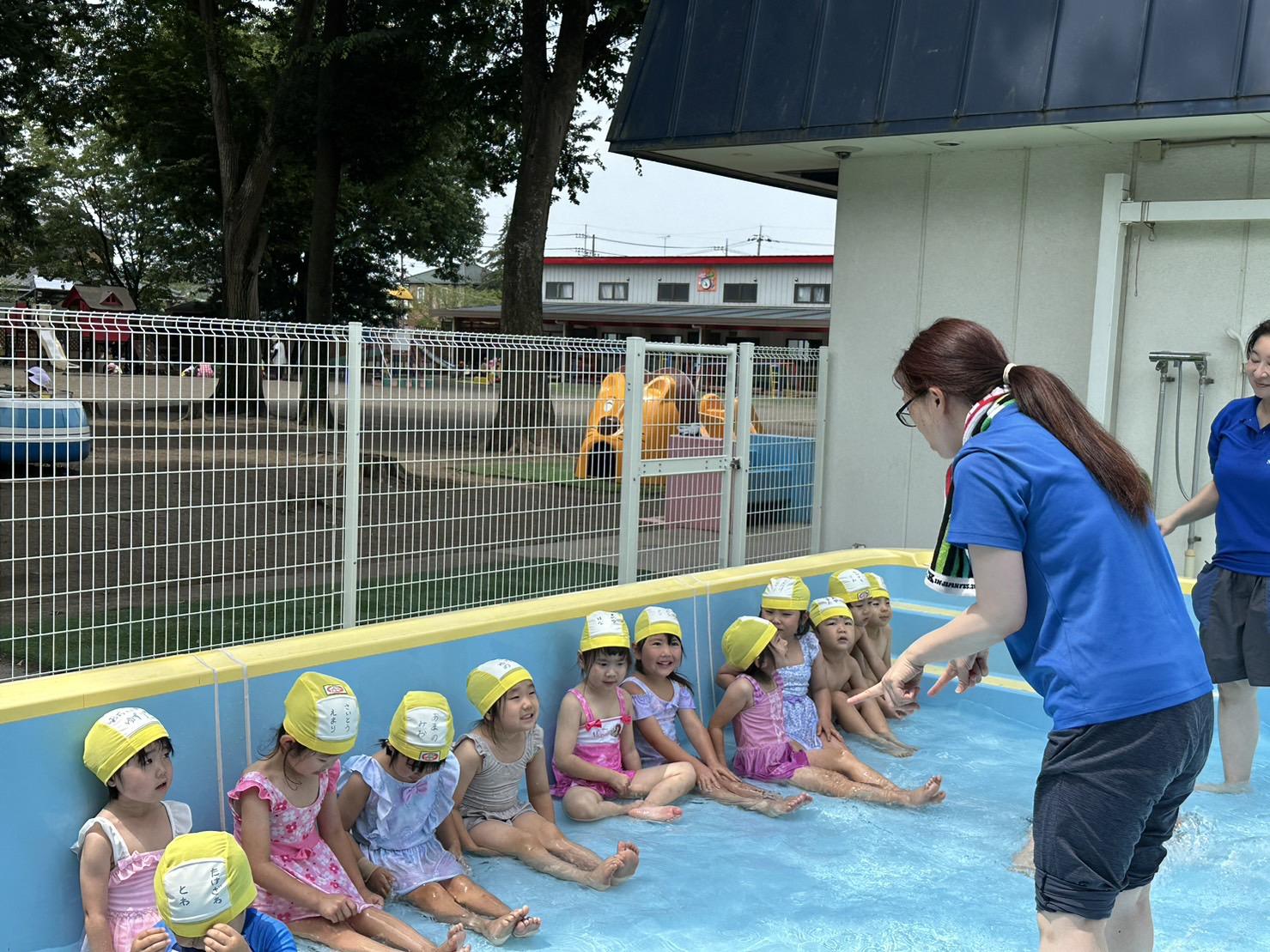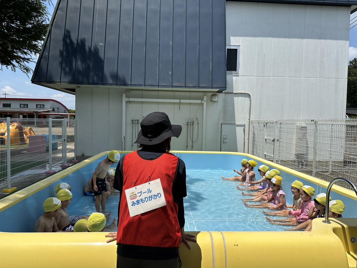 プール遊びの際は、担任の先生とプール見守り係の先生たちと複数の先生が一緒にプールに入り