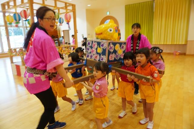 にじいろのさかなの絵本をモチーフにしたお神輿をひとりひとりの手形で作りました。