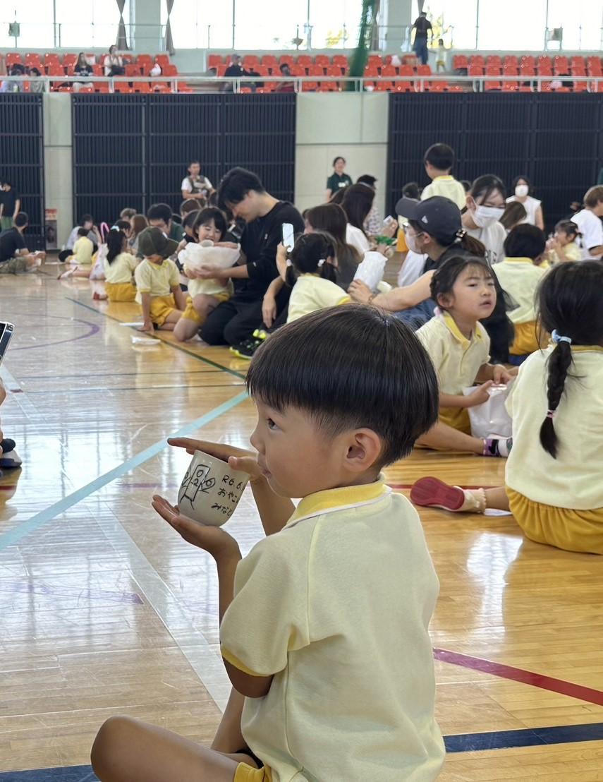 とんぼ組はお母さんへのマグカップ、ほし組はお父さんへの湯呑を陶芸で作りました。