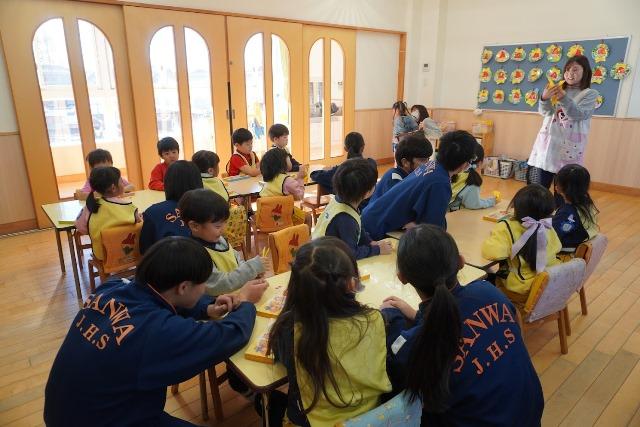 三和中学3年生が家庭科郊外学習でしらゆり幼稚園にきてくれました。