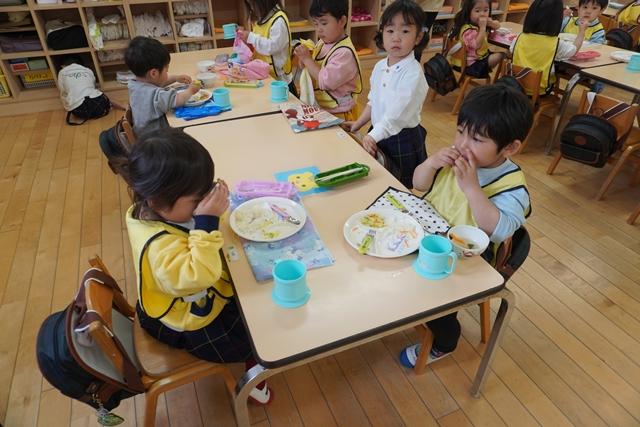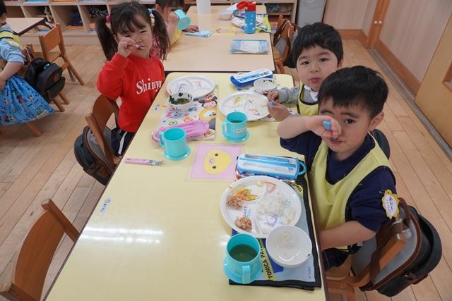 つくし組・なかよしランドの新入園児のお友達も給食が始まっています。