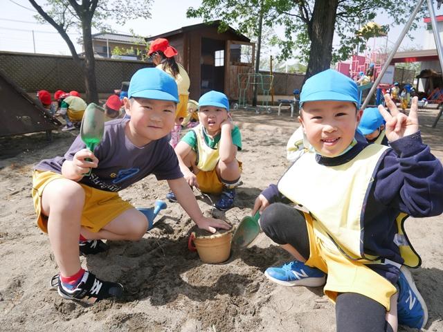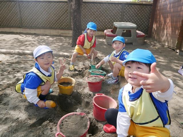 今朝のお外遊びでは、たくさんの砂に大喜びのこどもたち。