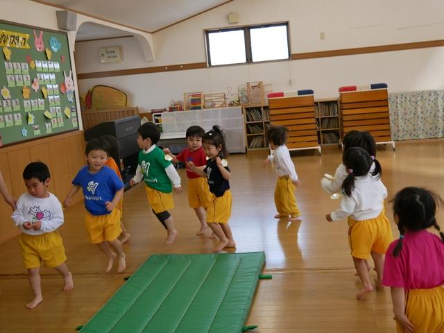 マットの周りを歩いてみたり、ウサギ跳びでピョンピョンしてみたり。