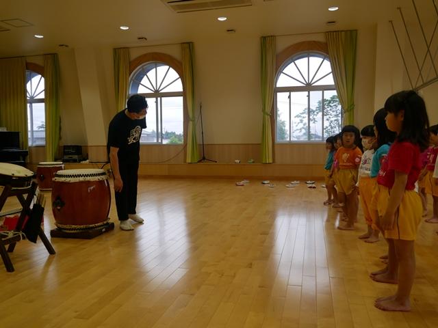 倉持先生から、バチの持ち方や姿勢、そしてリズム打ちを学びかけ声もつけながら太鼓をたたきました。