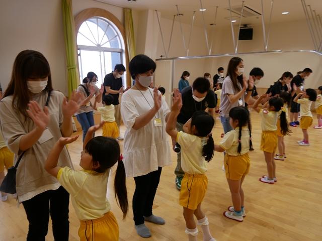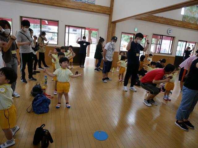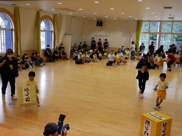 ホールでは、ほしA組・とんぼA組のお友達が元気いっぱいダンスや親子競技を楽しみました。