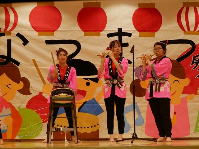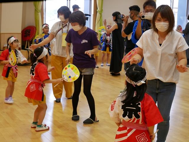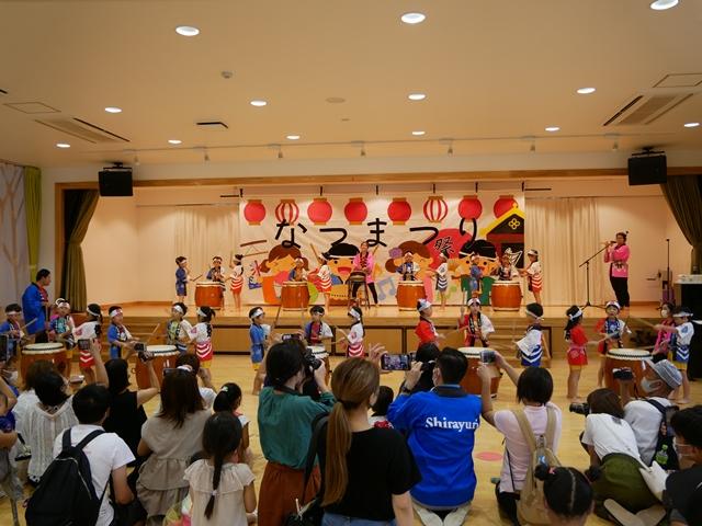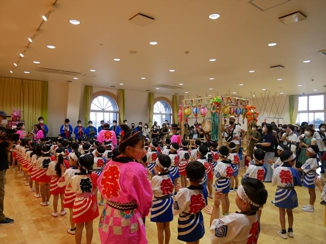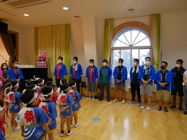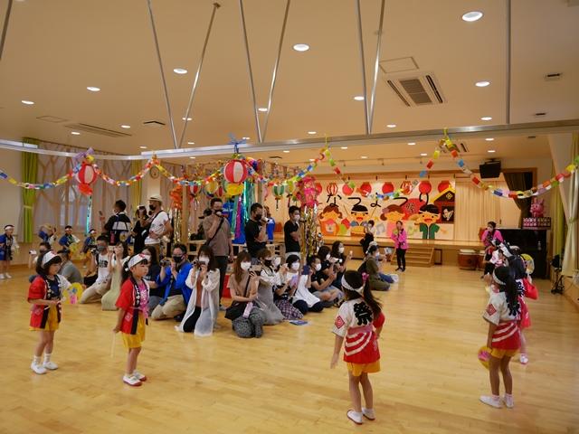 ホールでは、集合写真撮影をして、しらゆり音頭や親子盆踊りを踊りました。