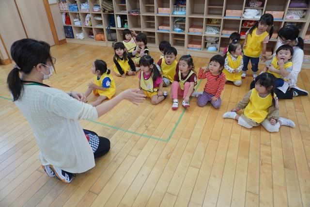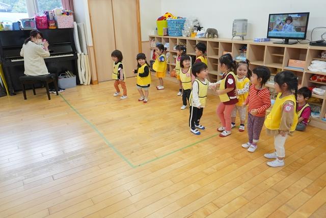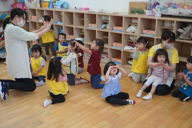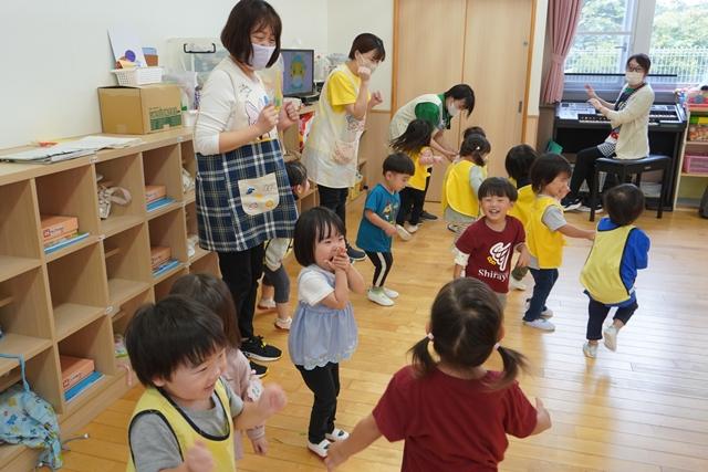 先生と一緒にお歌を歌ったり、ピアノの音に合わせて、体を動かしたり