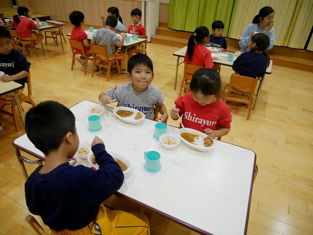 給食室の先生が、みんなが大好きなカレーと唐揚げ・マカロニサラダを作ってくれました。