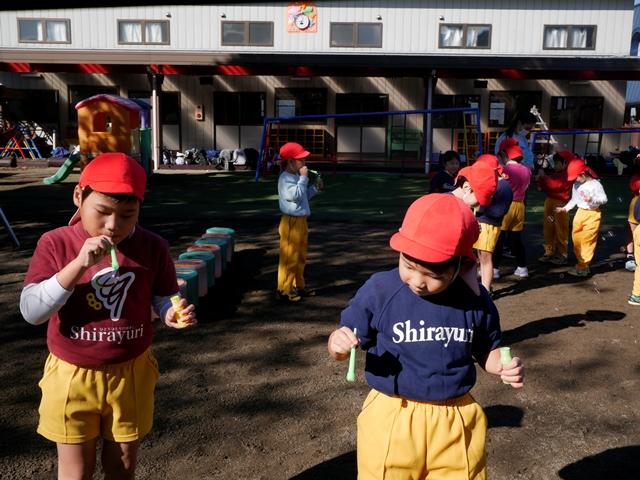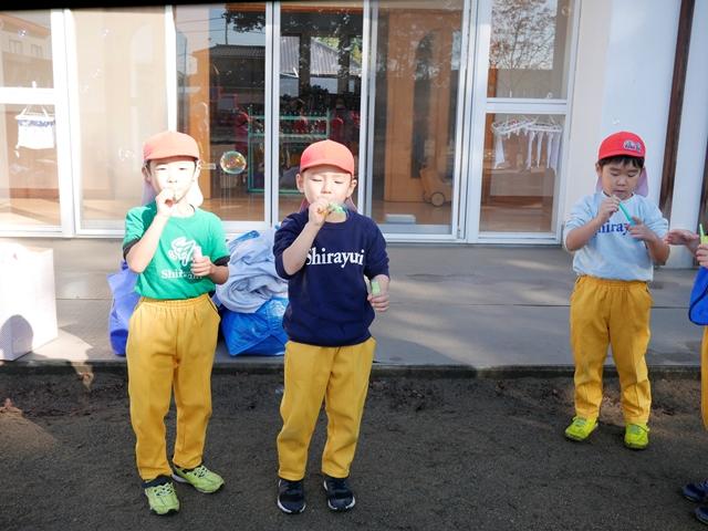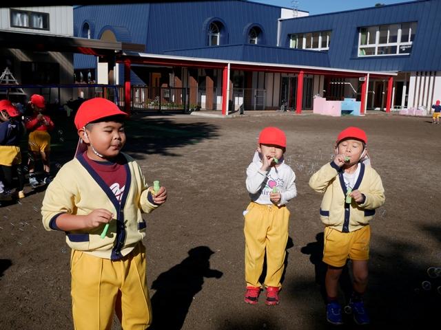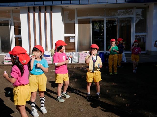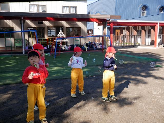 帰りの支度を整えて、園庭でシャボン玉や外遊びを楽しみました。