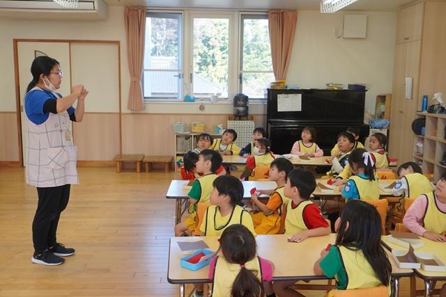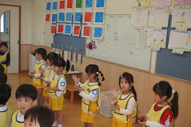 とんぼ組さんは、秋の折り紙製作や松坂先生の音楽遊びをしています。