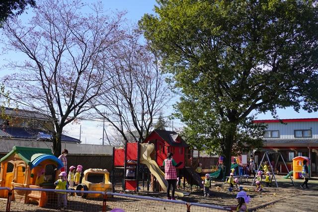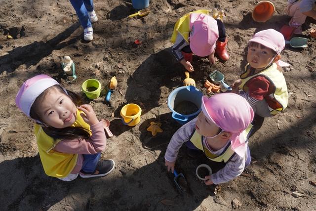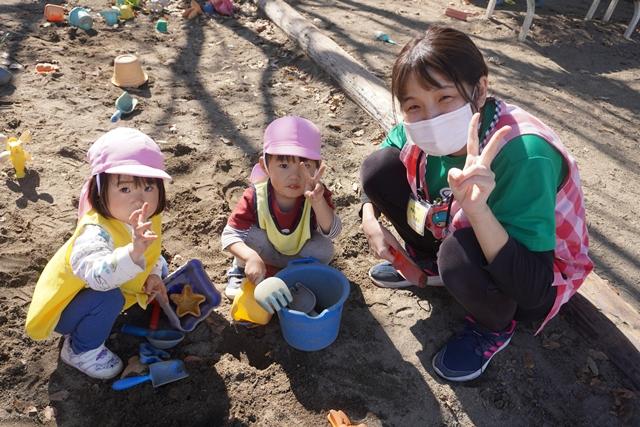園庭では、つくし組・なかよしランドのお友だちが、砂場や滑り台で先生やお友だちと楽しく遊んでいます♪