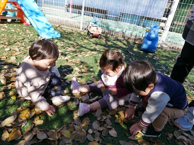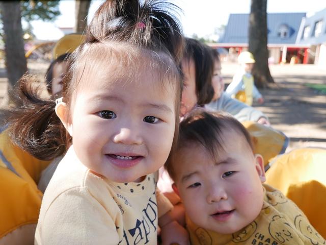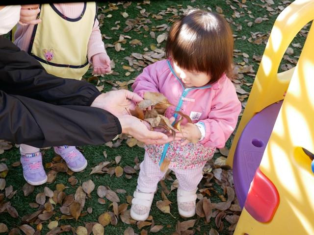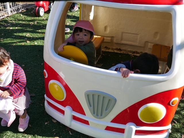 お散歩カーでお外に出たお友だちは、うさぎさんを見たり、どんぐりや落ち葉を見つけました。