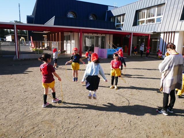 午後は、園庭でたくさん遊びます。浅井先生の体操でなわとびを始めたので、お外遊びの時間でも少しずつ練習しています。