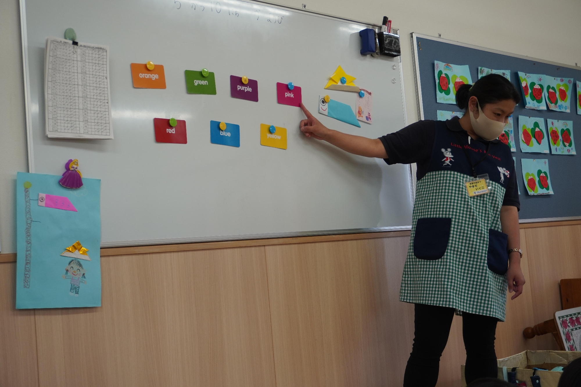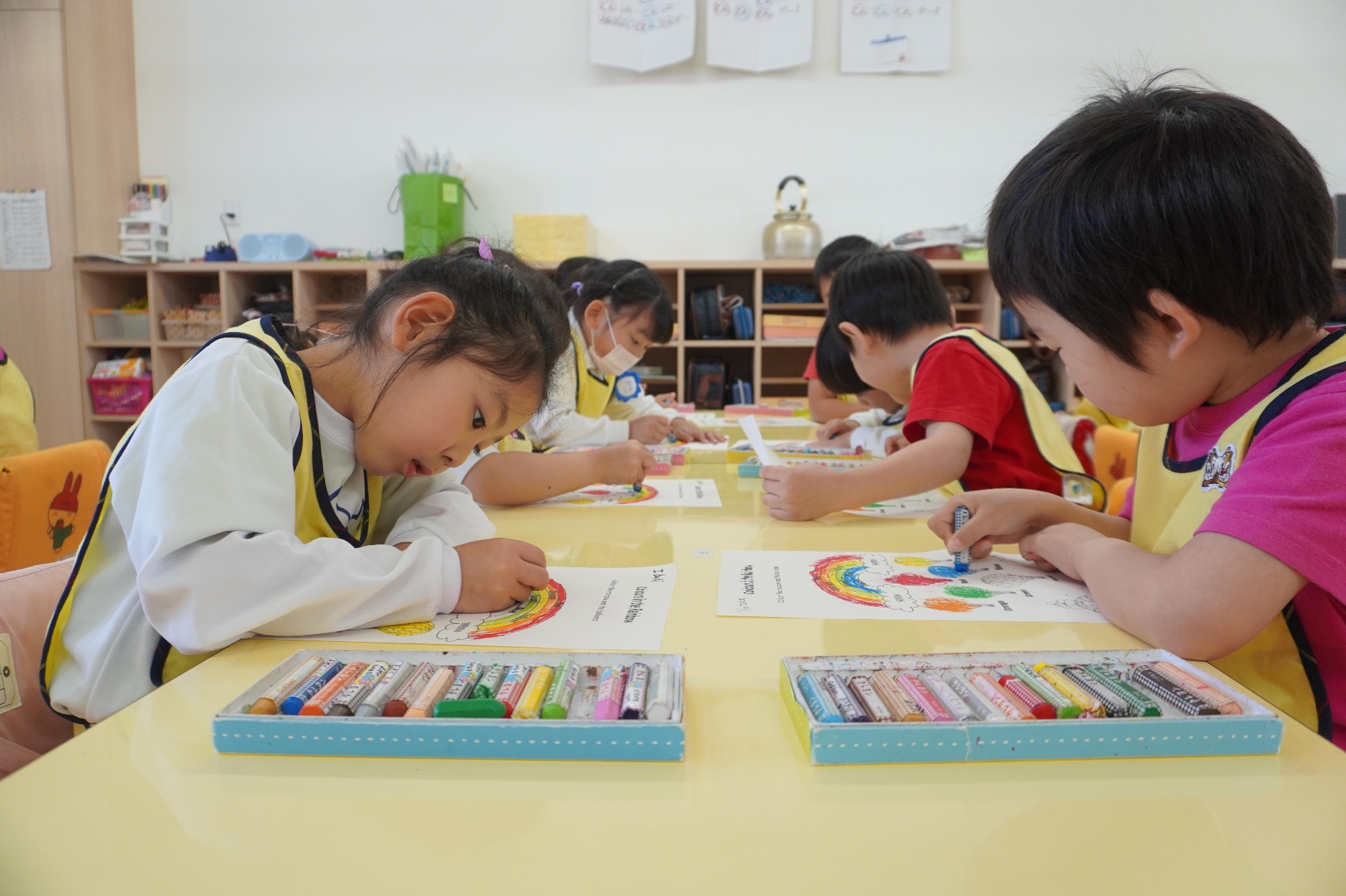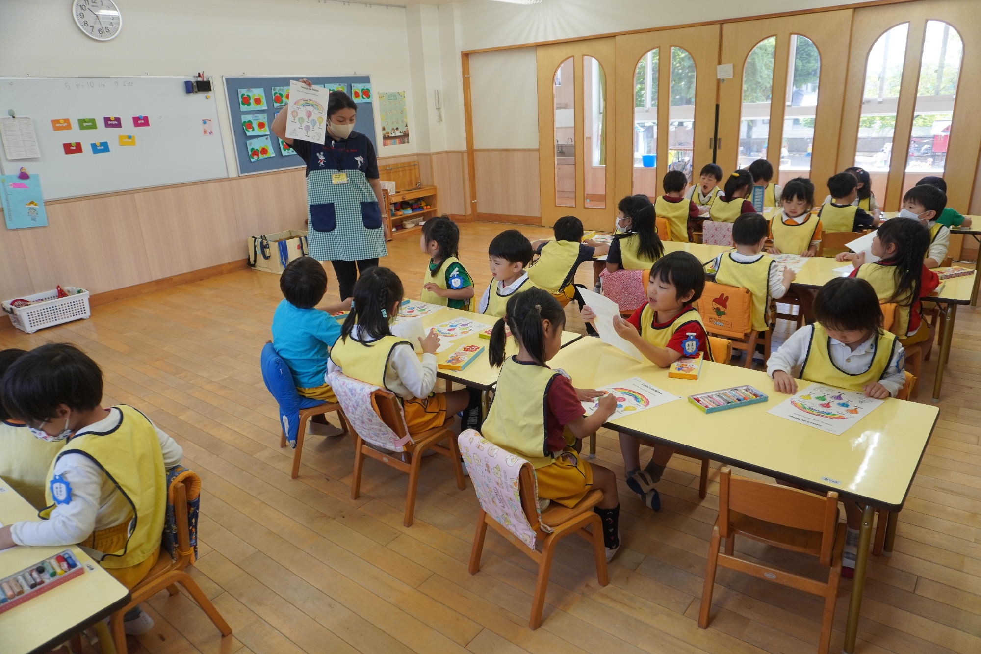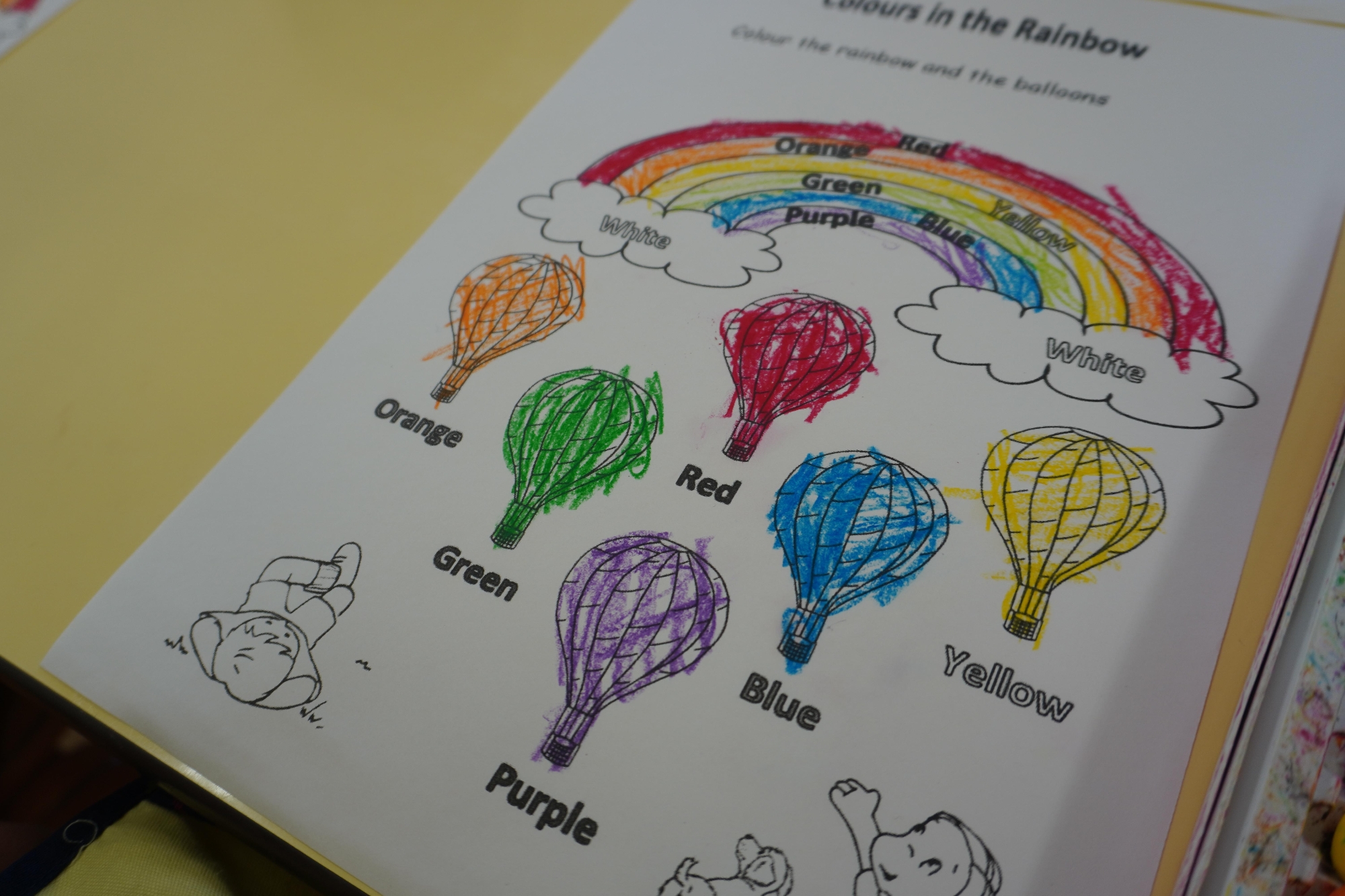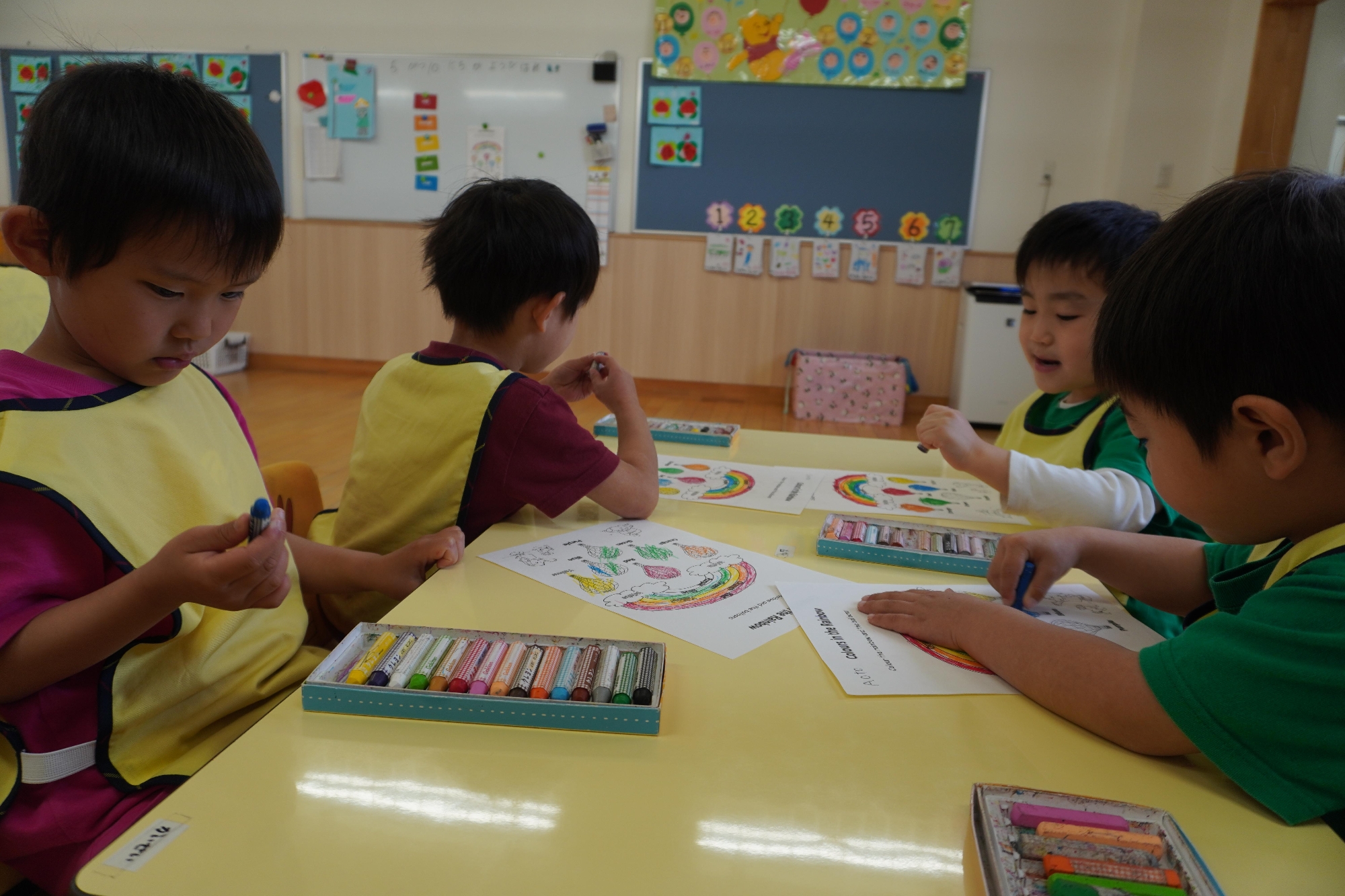 これまで習った色を表すえいごを使って、虹と気球の色塗りをしました。