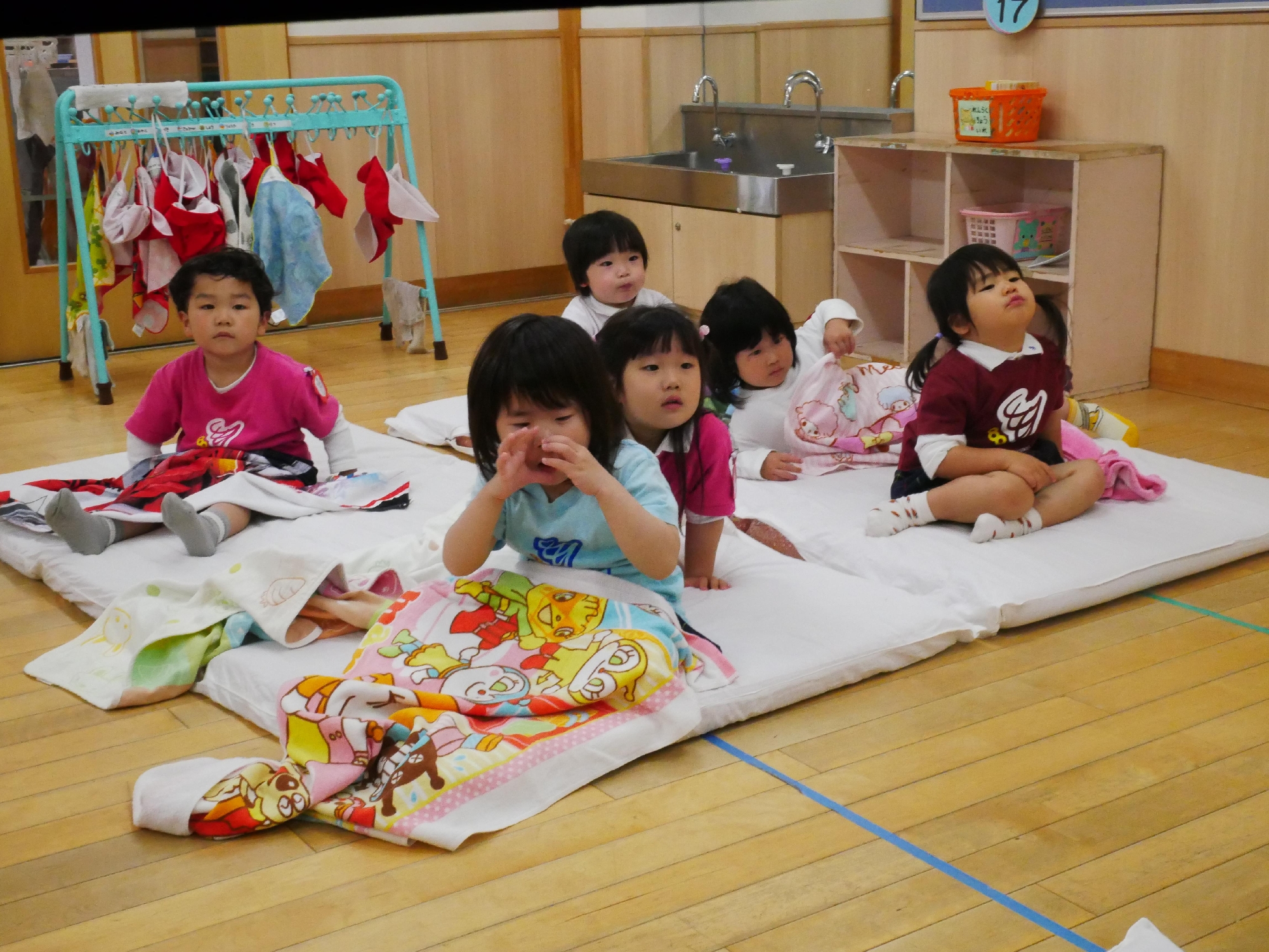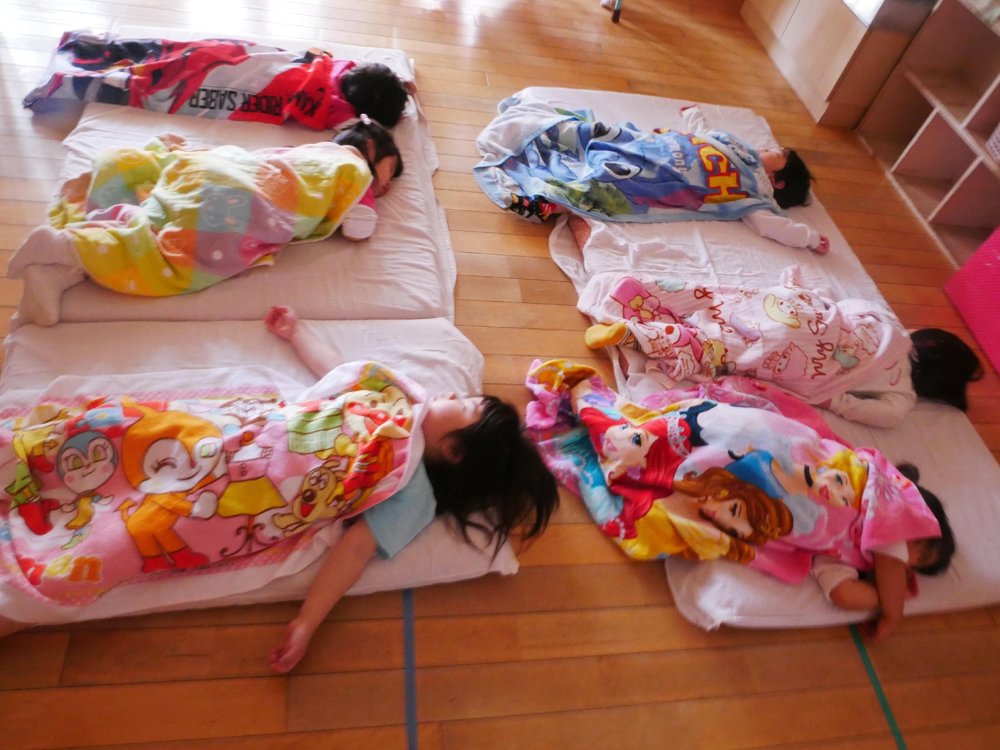 担任の先生に紙芝居を読んでもらってから、「おやすみなさい」と言ってみんなで上手に布団にゴロンとできていますね。