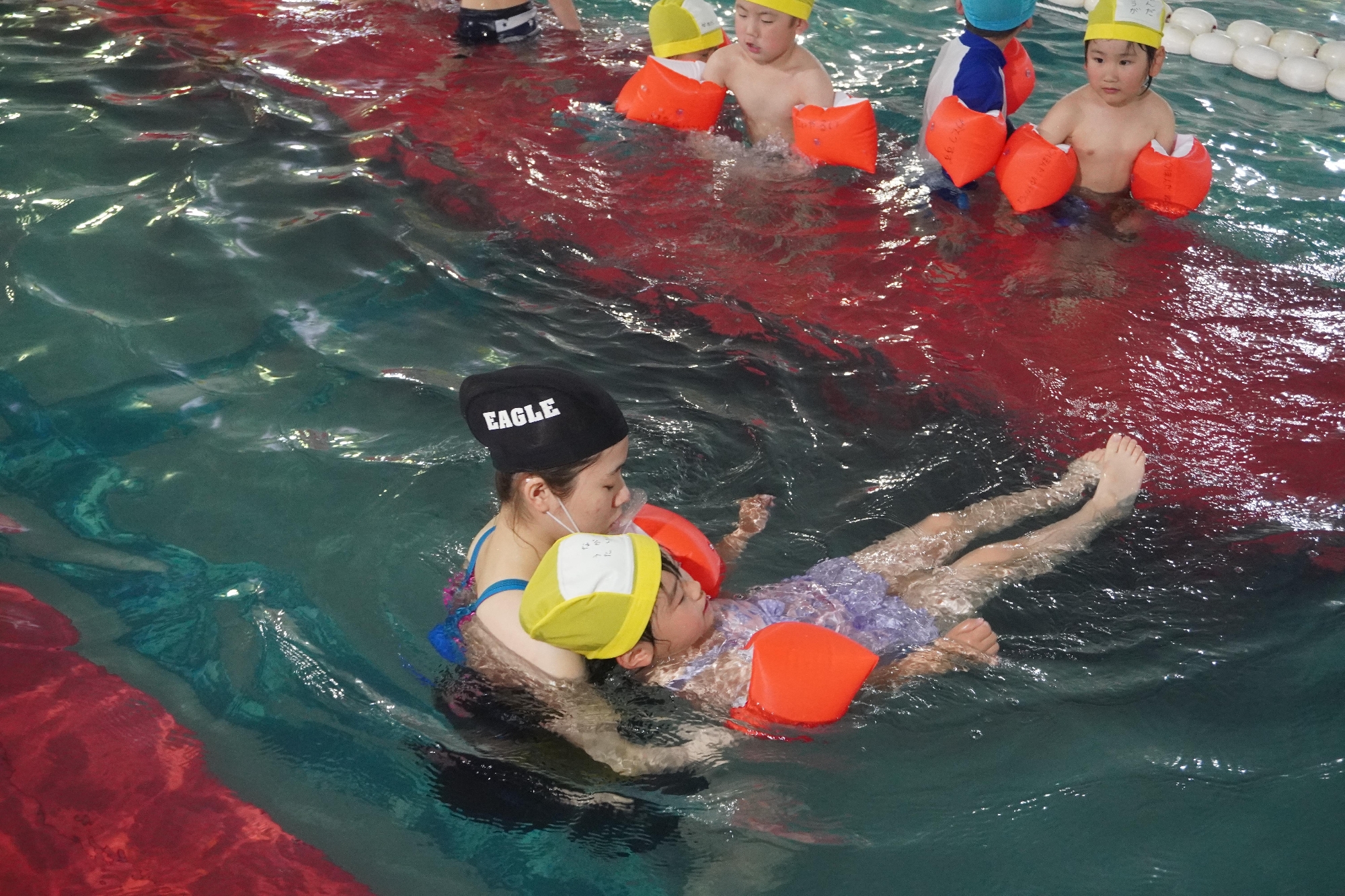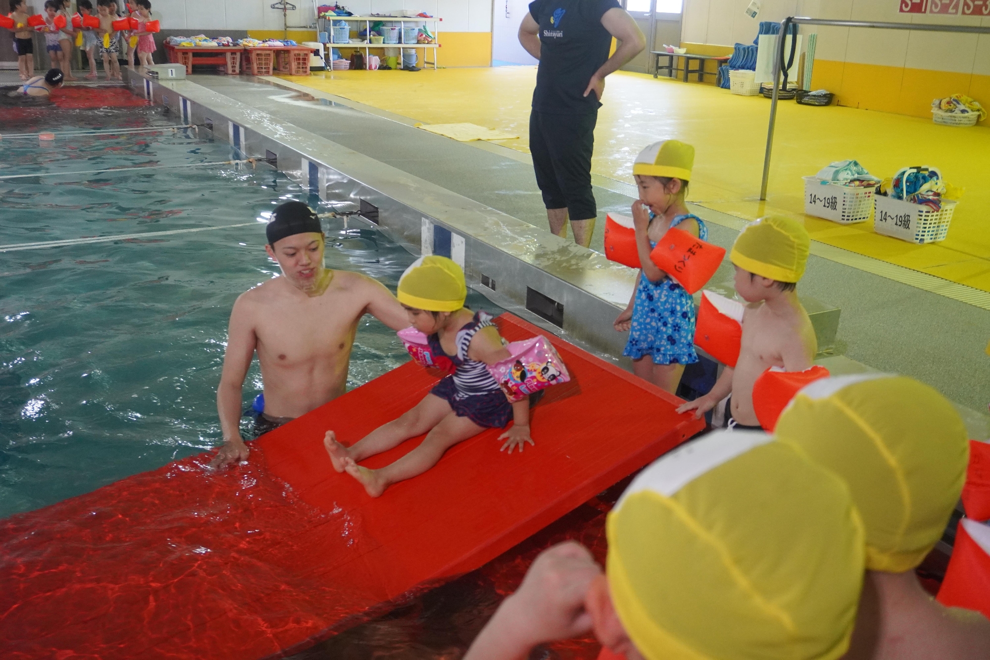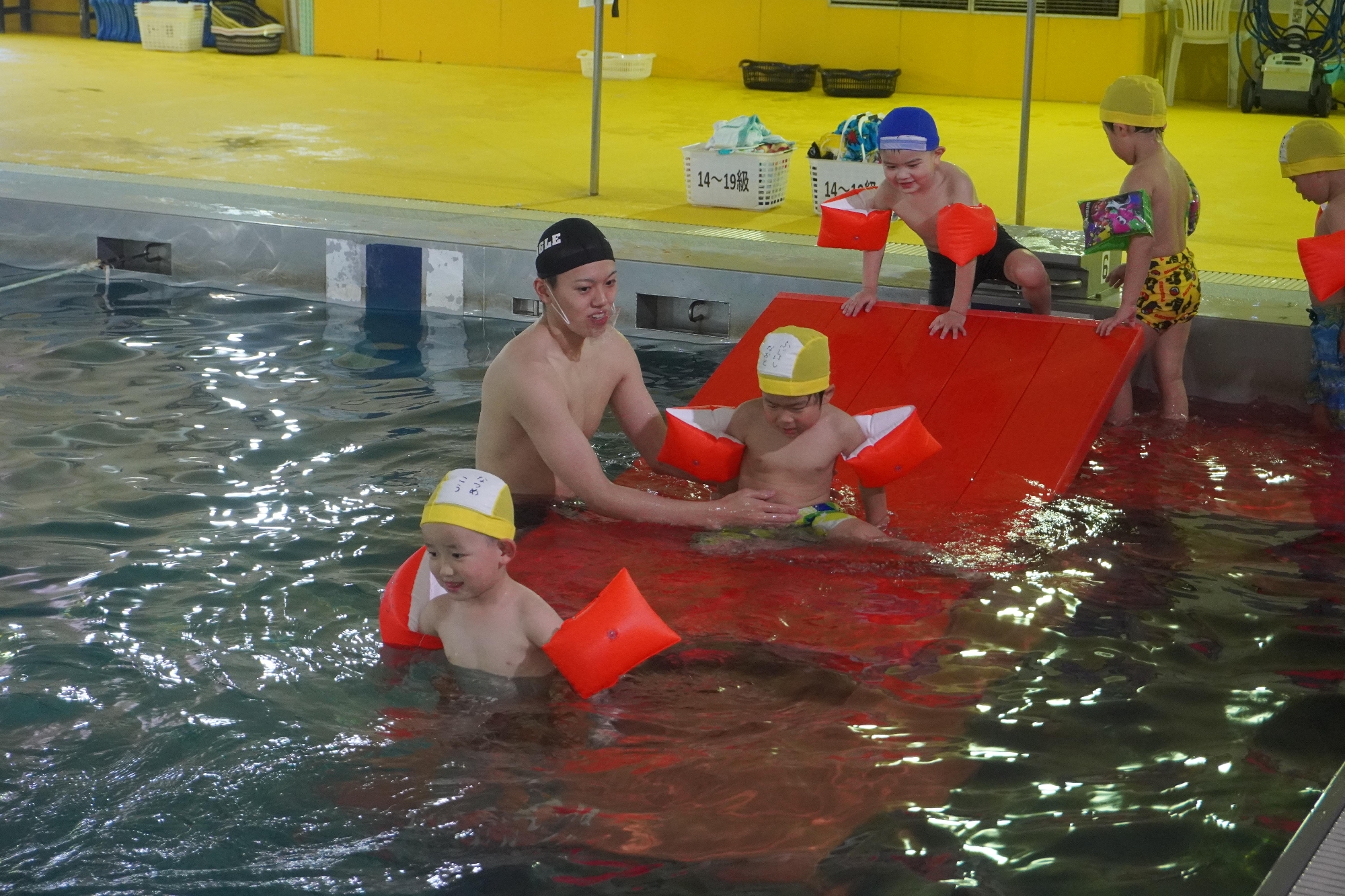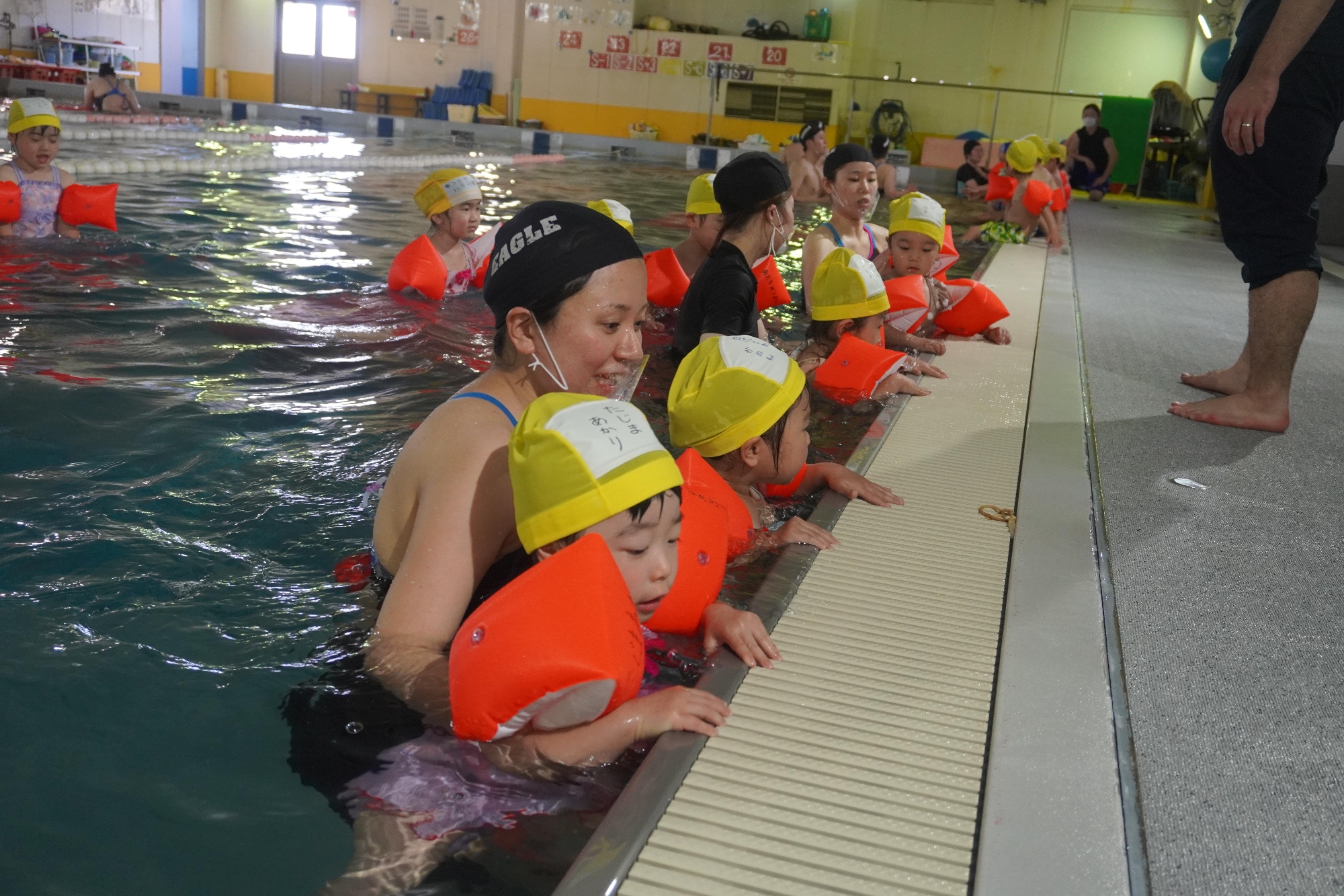 スイミングのコーチの話をよく聞き、カニさん歩きやバタ足等、たくさんのことをやりました。