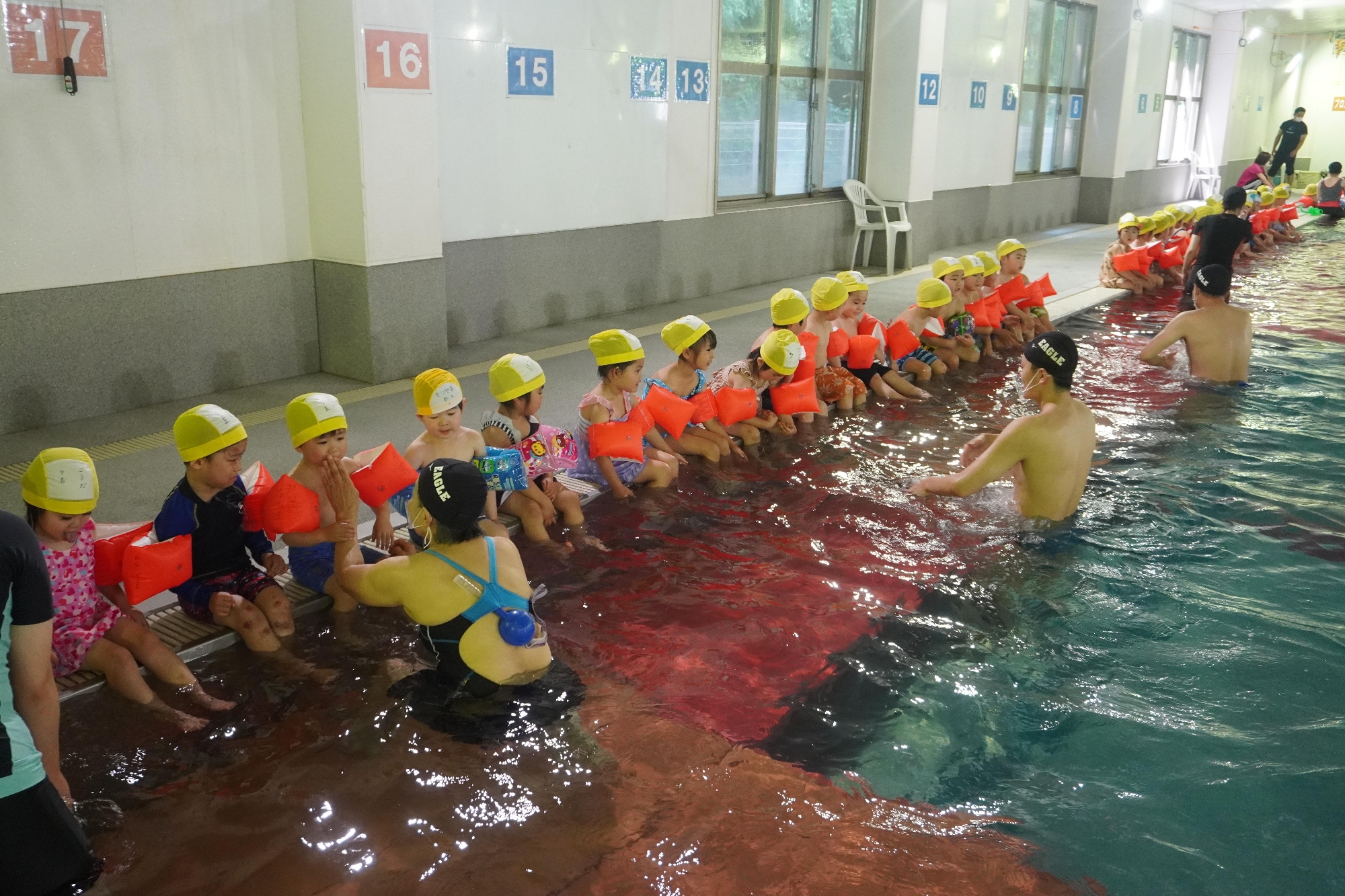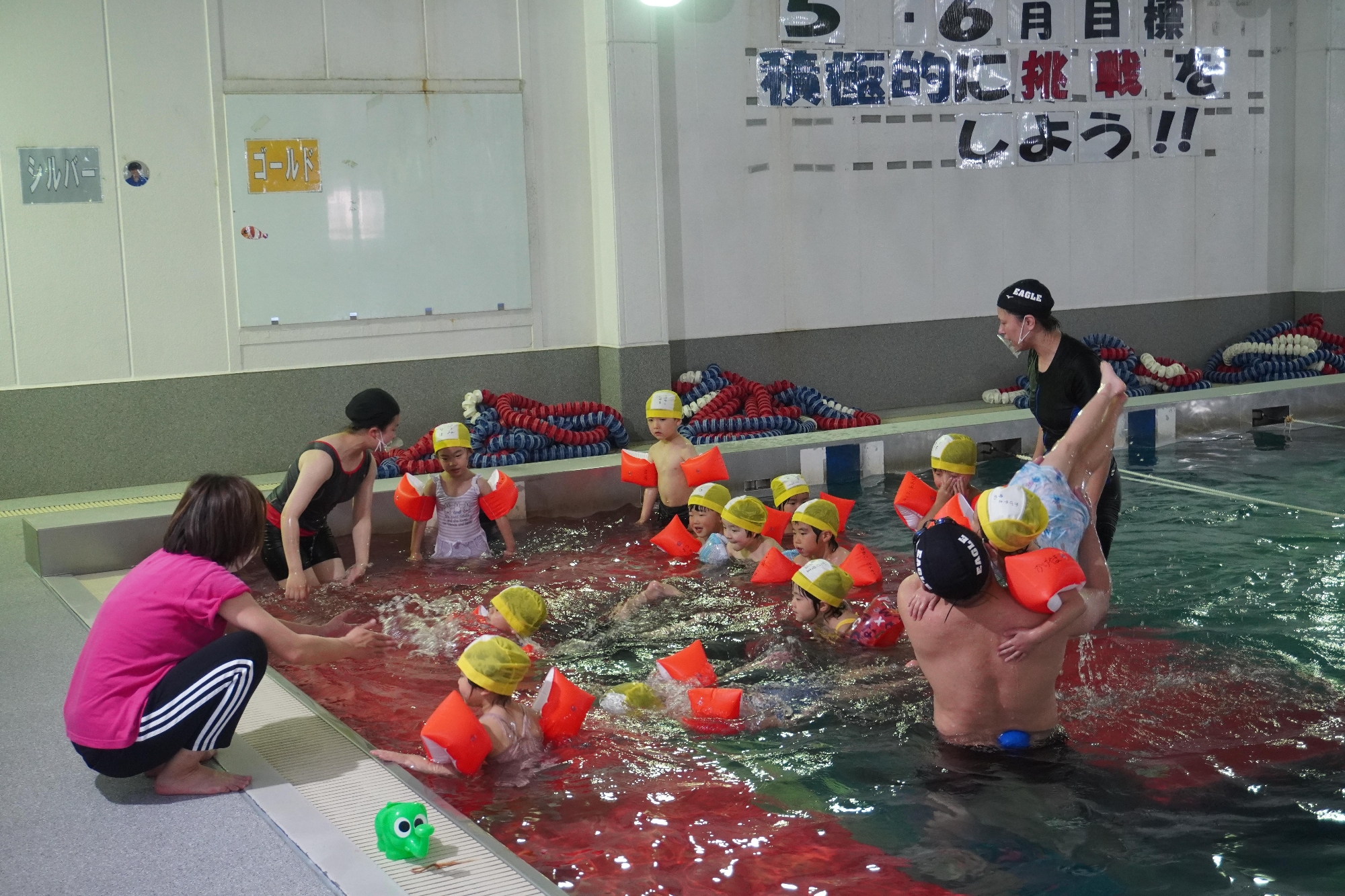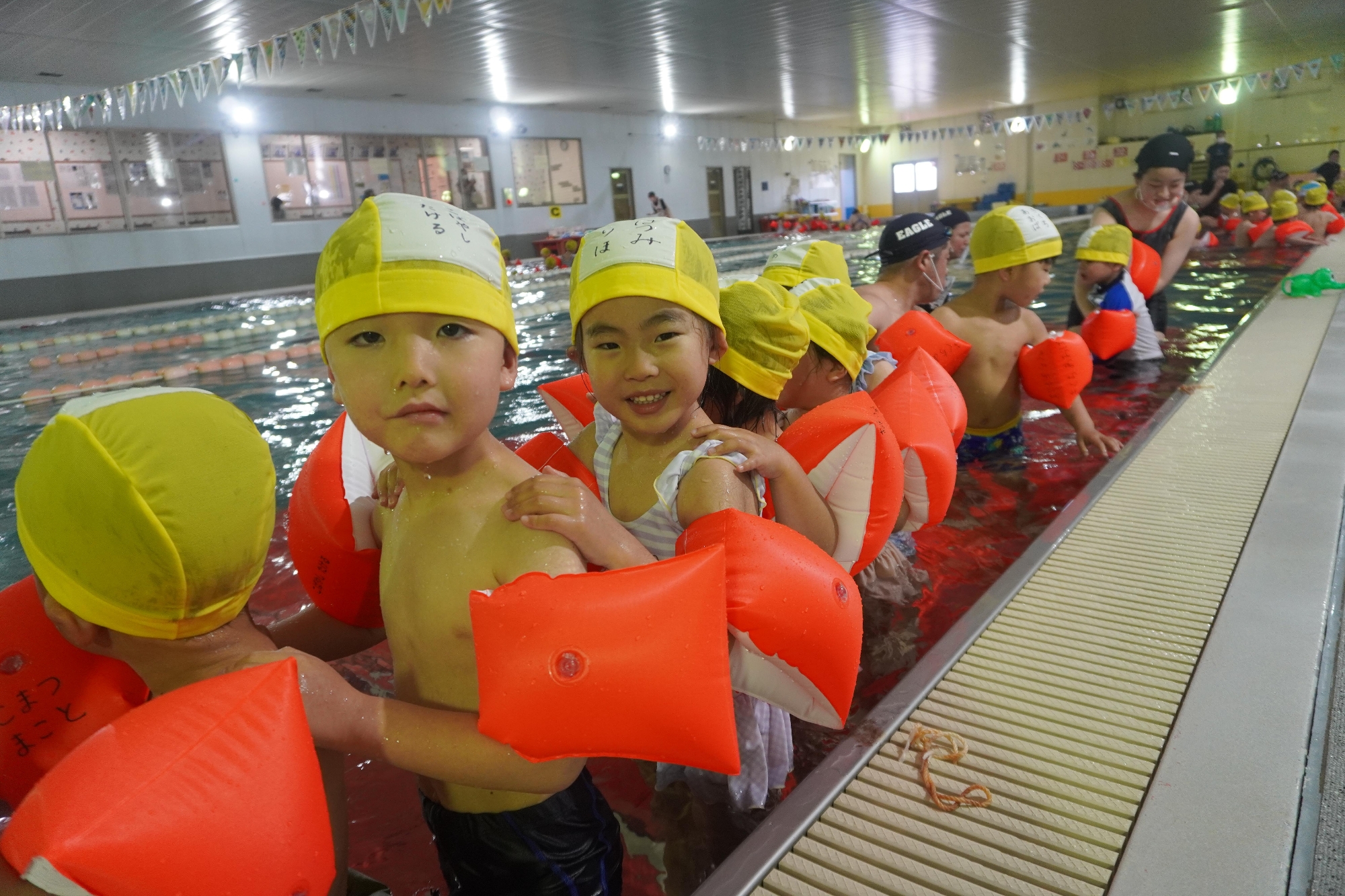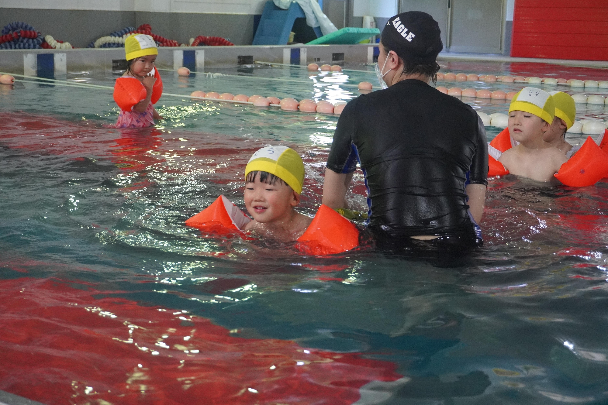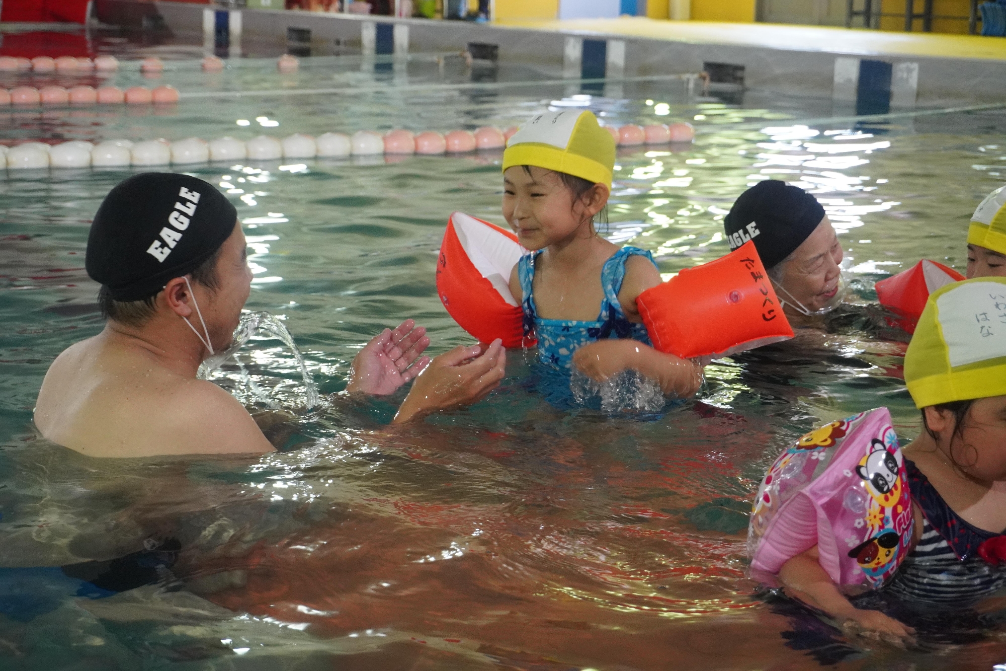 スイミングのコーチの話をよく聞き、カニさん歩きやバタ足等、たくさんのことをやりました。